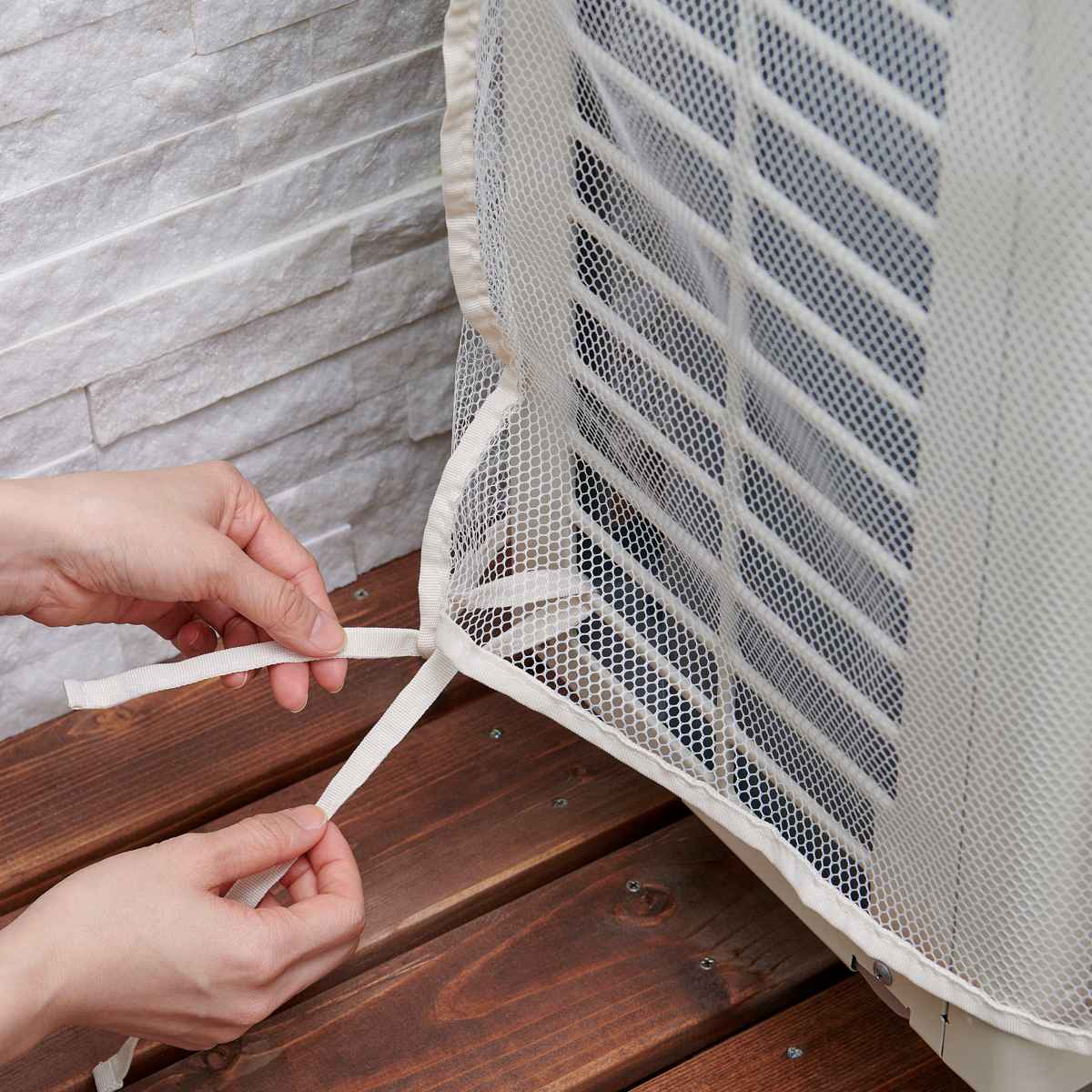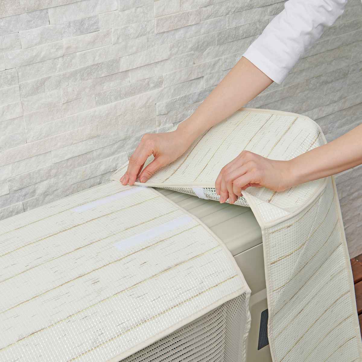 面ファスナーで、自宅の室外機に合わせてサイズ調整が可能です。また通気の良いメッシュなので、吸気・排気を妨げにくいです。