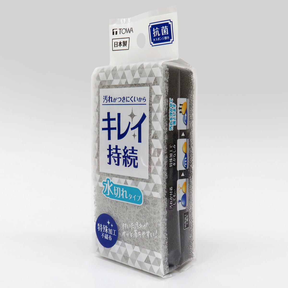 汚れがつきにくい特殊加工不織布と水切れの良い粗目スポンジの2層構造です。汚れが付着しても特殊加工で不織布に水がなじみ、汚れを浮かせて落とします。