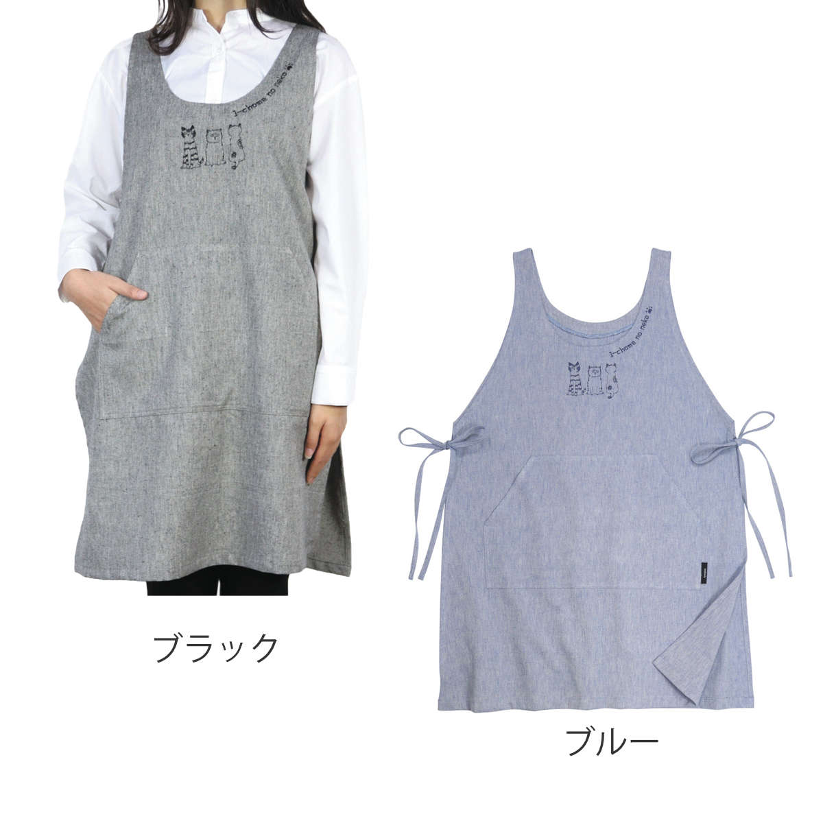 エプロン サイドリボン チュニックタイプ フルエプロン 刺繍 ( キッチンエプロン 台所エプロン ドレスエプロン 綿100% ポケット付き ネコ 胸当てエプロン かぶるだけ チュニック フリーサイズ 大人用 レディース インド綿 猫柄 ) 【ブラック】