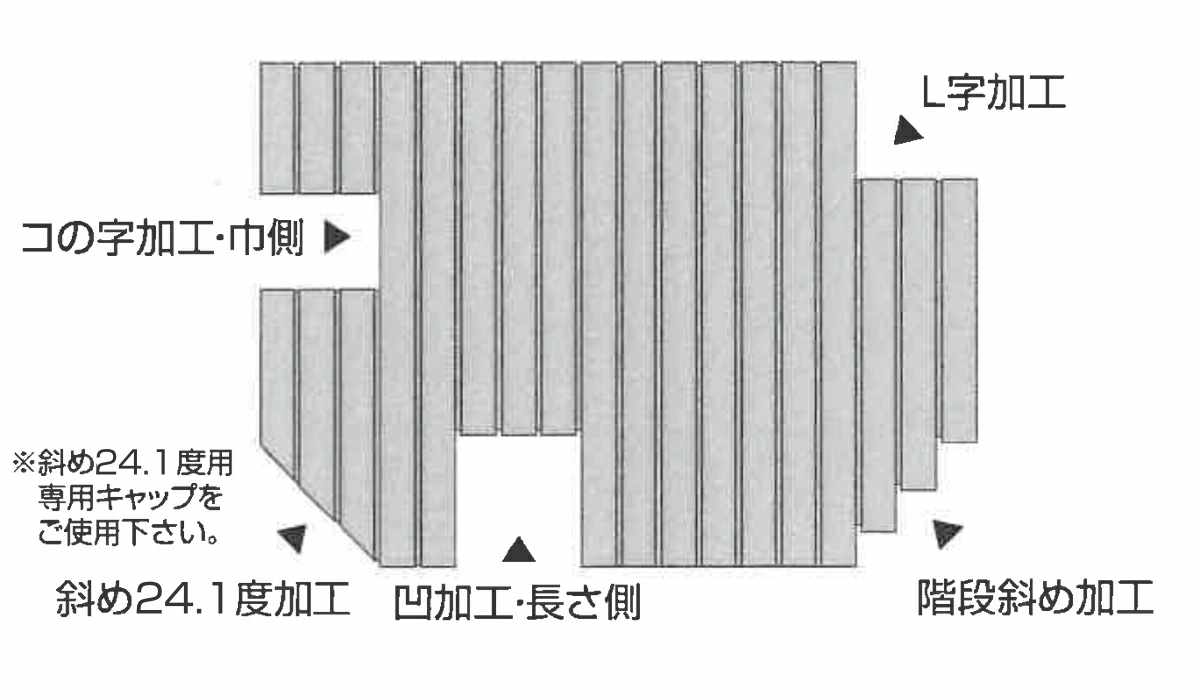 | 注意事項 | ※斜め24.1度加工専用キャップです。コの字加工・凹加工・L字加工・階段斜め加工にはご使用いただけません。 ※工具や接着剤などは付属しておりません。 |