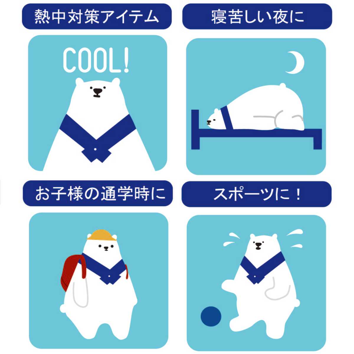 接触冷感効果のあるクール糸を使用した冷感タオルです。屋外での熱中症対策はもちろん、冷房の補助アイテムとしても重宝します。保冷剤付きなのでさらにひんやり感が長続きします。
