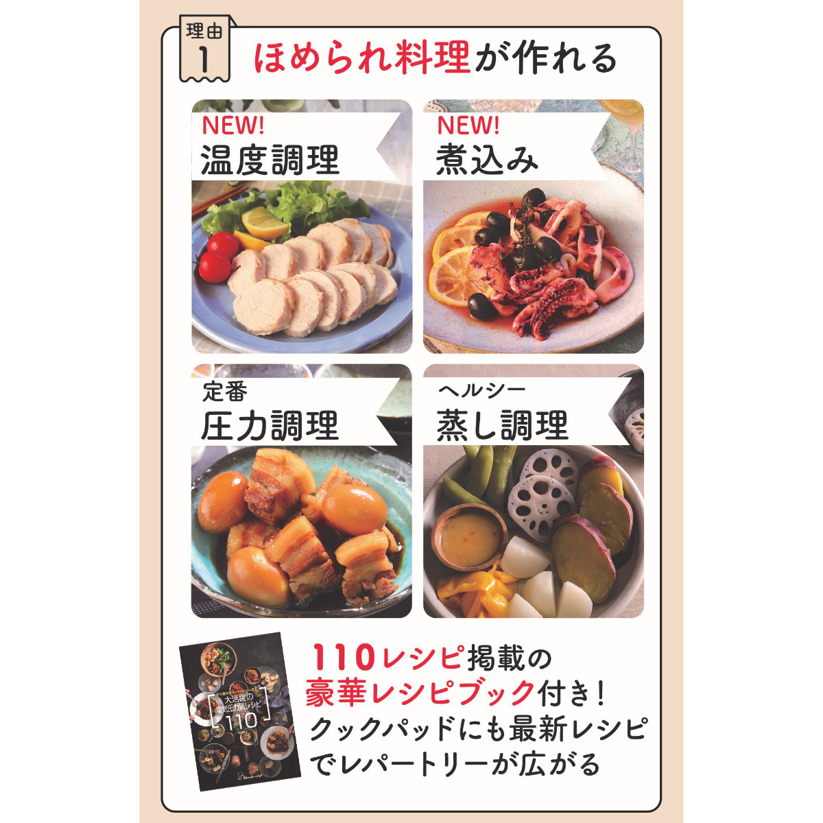 110の専用レシピが掲載された、豪華なレシピブック付きです。作り置きから、パーティーまで、毎日の献立にも大活躍します。
