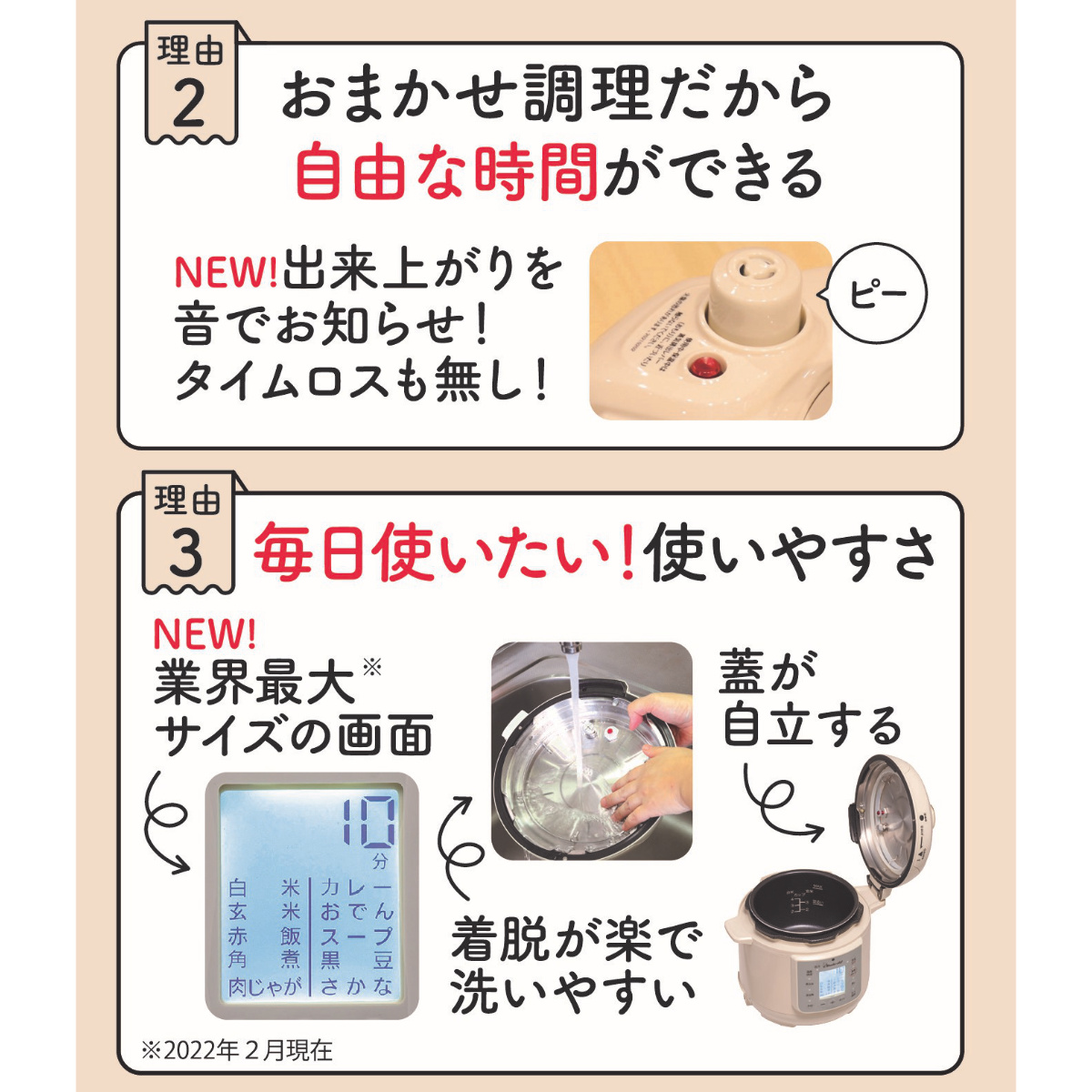 毎日使う道具だから、何気ないところにも便利な機能がたくさんある、電気圧力鍋です。調理中立った人から見やすい大きな液晶。着脱簡単な蓋・パッキン。110の専用レシピブックが付属など。届いた日から毎日のお料理がもっと楽しくなる電気圧力鍋です。