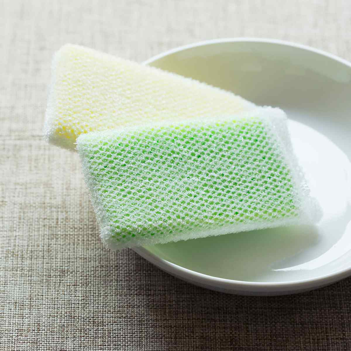 キズをつけずに汚れをしっかり落とすパイルネットでスポンジを包んでいます。グリーン、イエローの2色セットです。