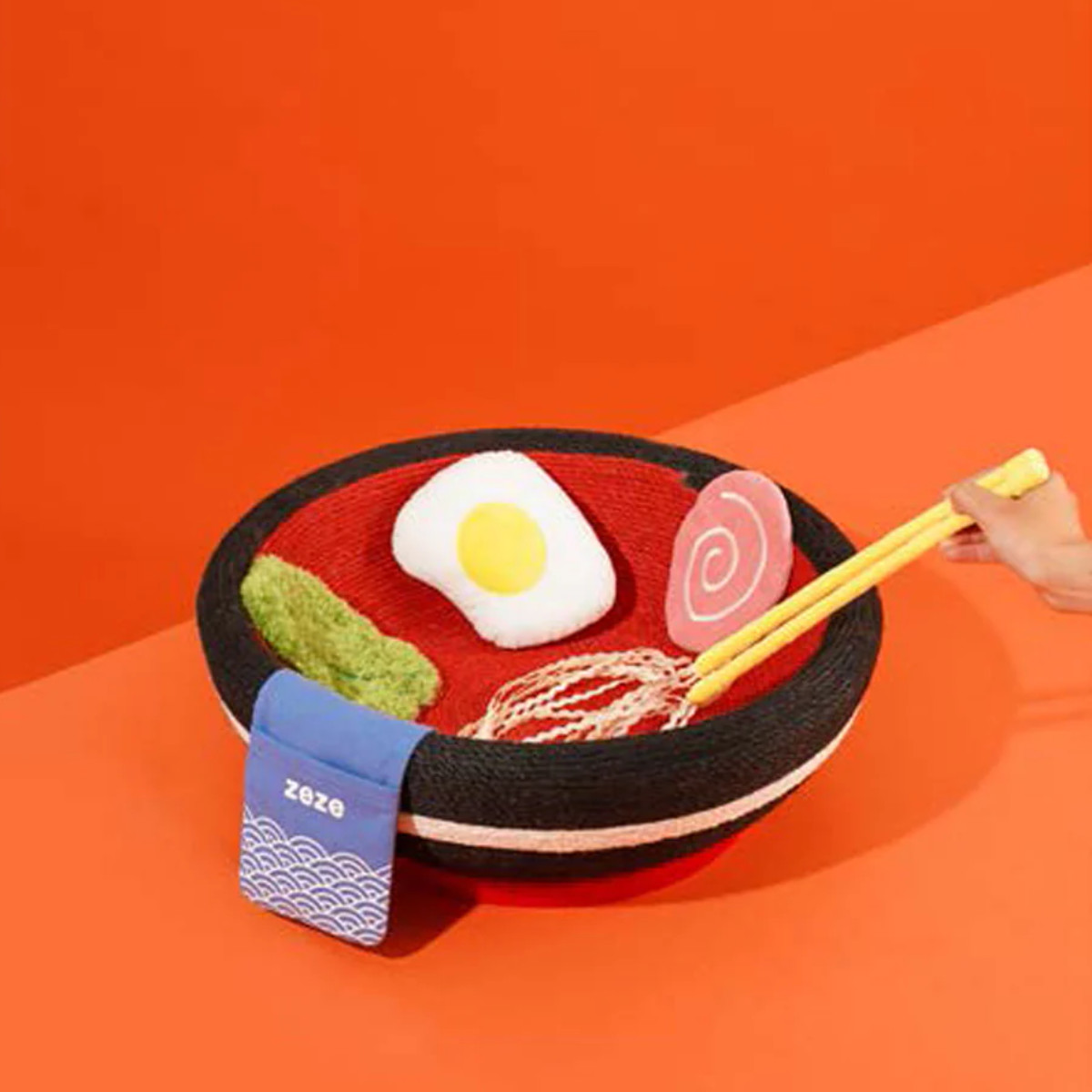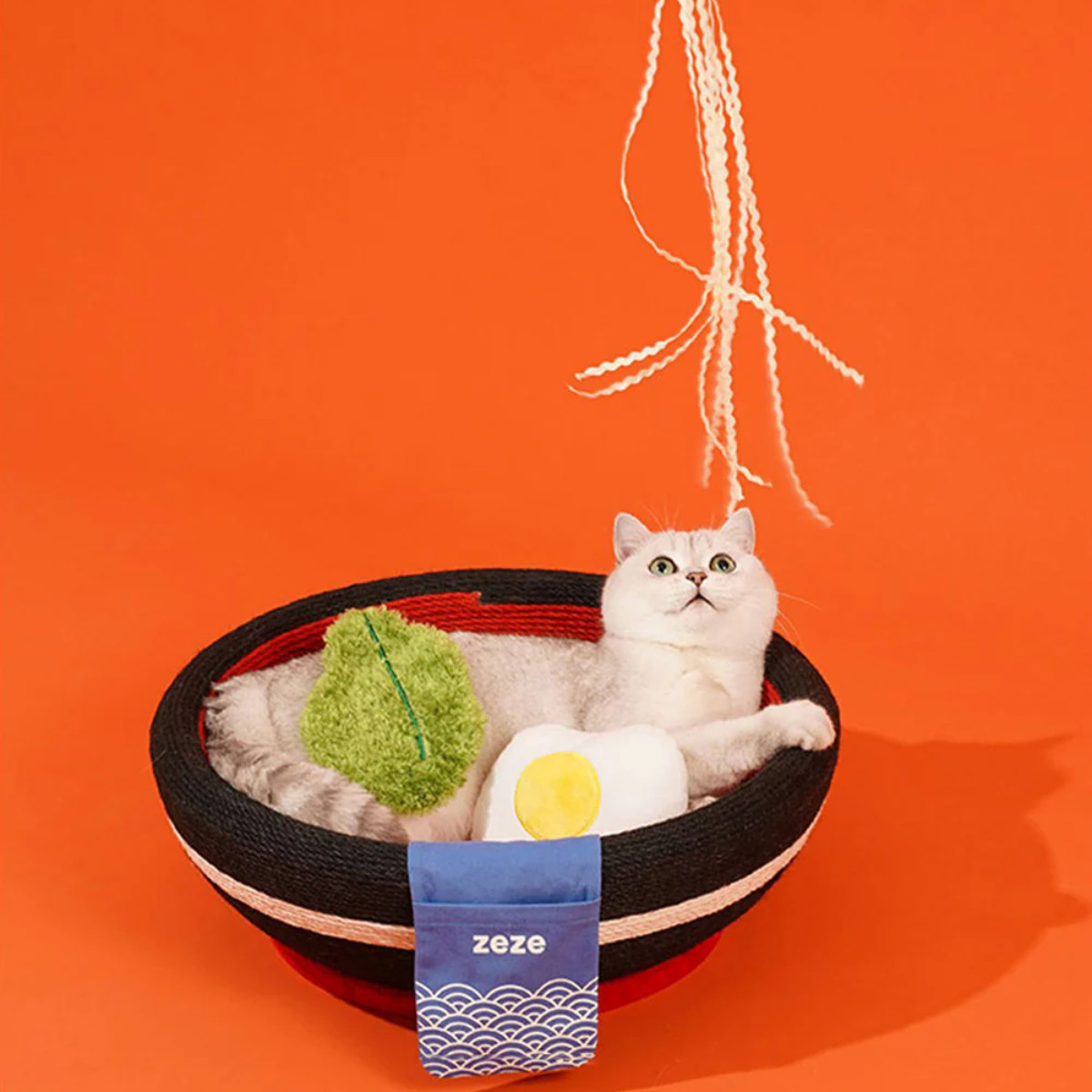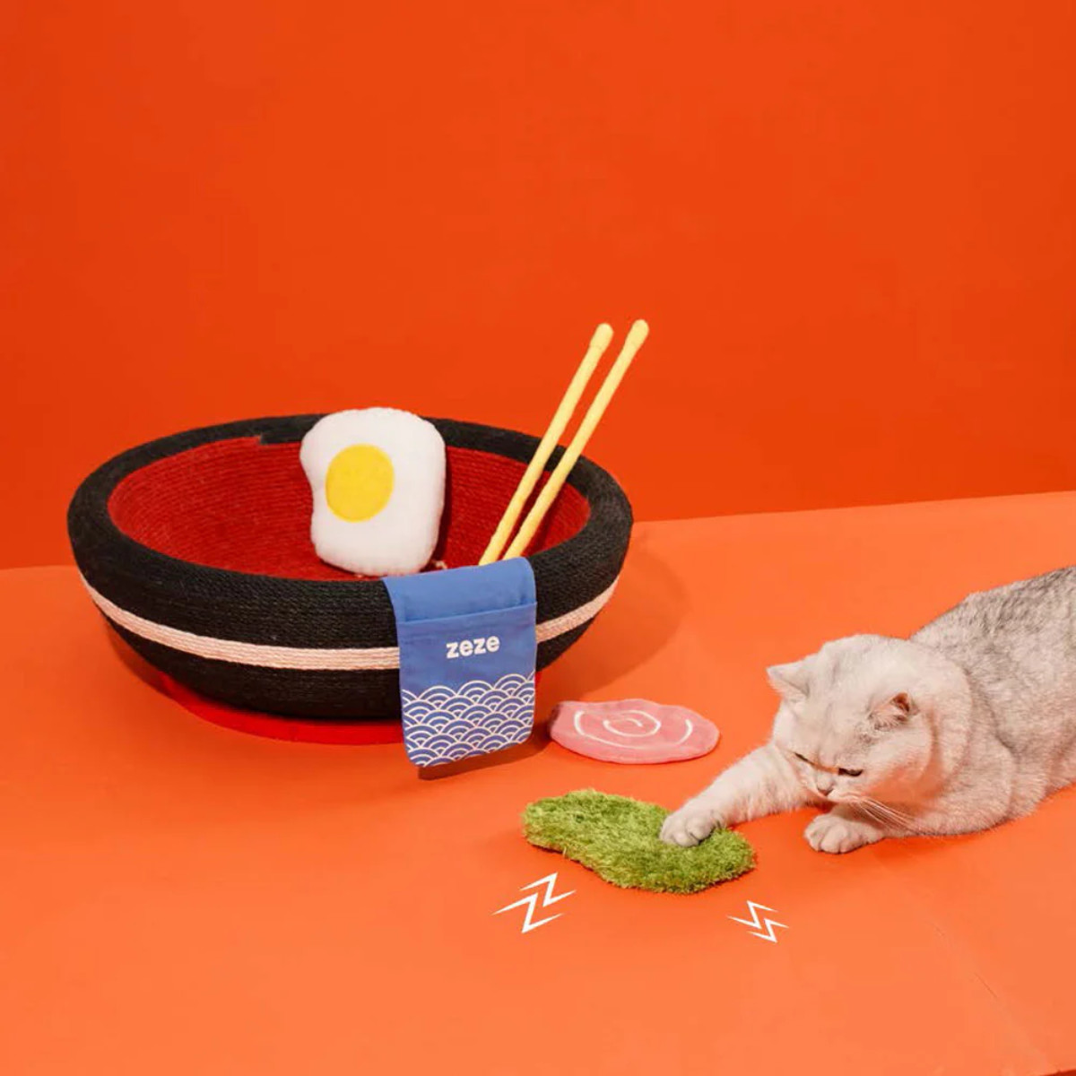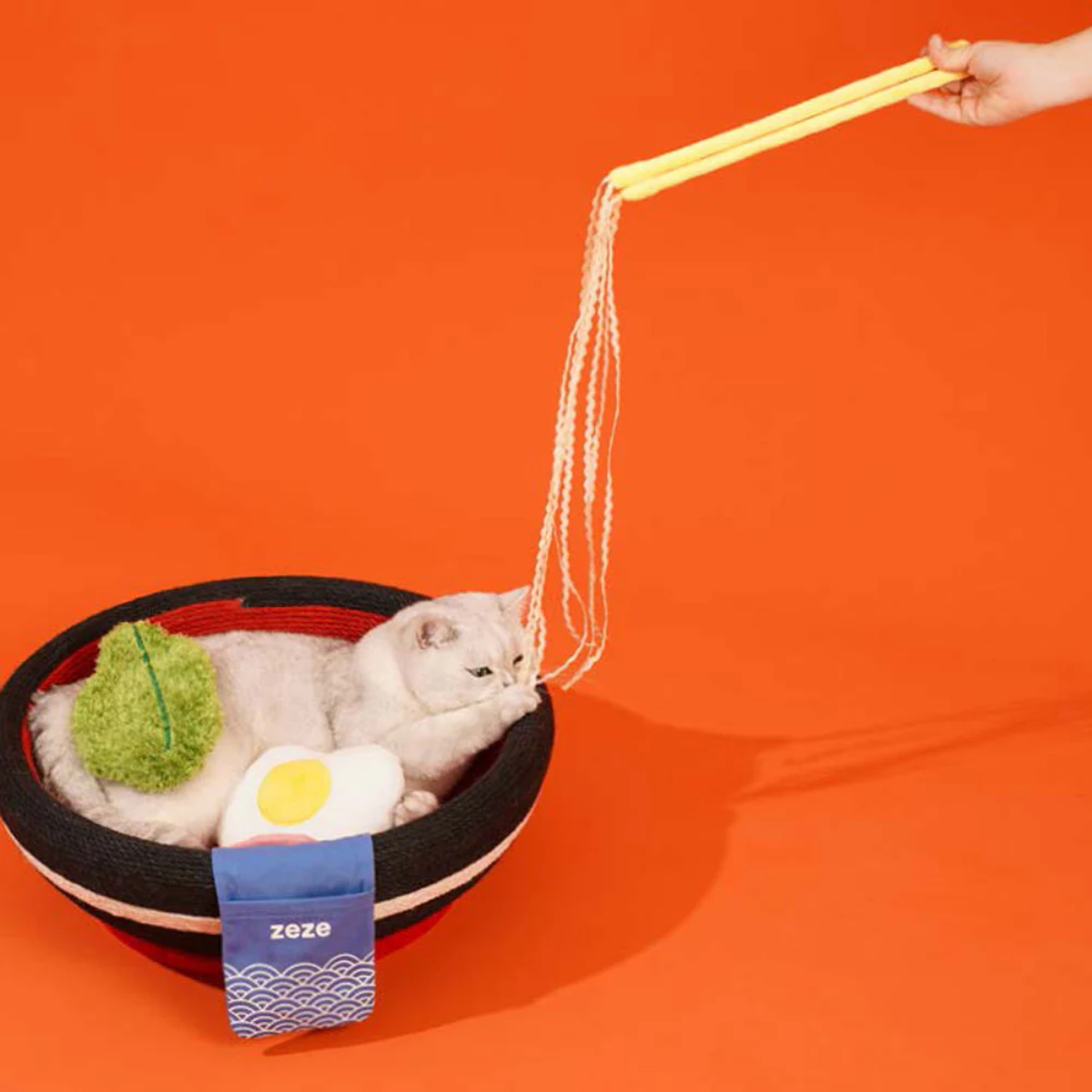 この一杯のラーメンにはさまざまなトッピングが付いています。トッピングはそれぞれねこちゃんのおもちゃとして機能しています。トッピングの他にも、お箸の先は麺をイメージした猫じゃらしになっていて、ラーメンを欲しがるようなねこちゃんの姿がとてもかわいいです。