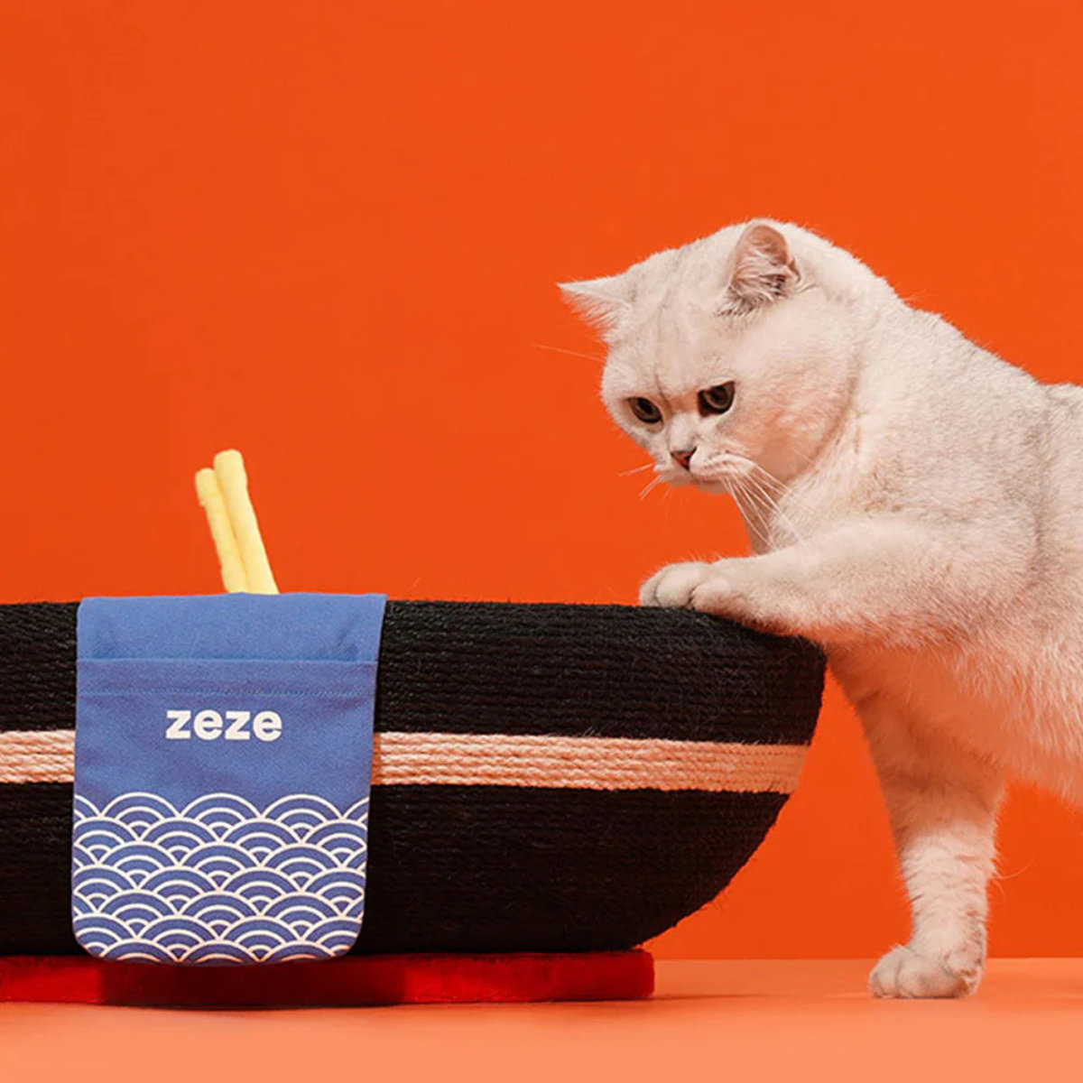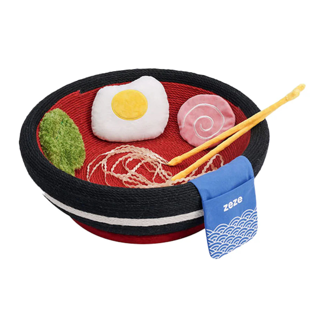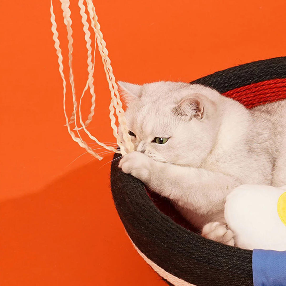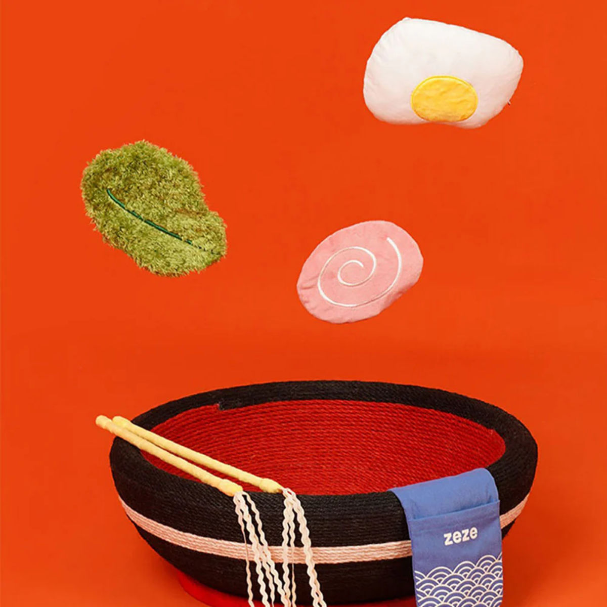 この一杯のラーメンにはさまざまなトッピングが付いています。トッピングはそれぞれねこちゃんのおもちゃとして機能しています。トッピングの他にも、お箸の先は麺をイメージした猫じゃらしになっていて、ラーメンを欲しがるようなねこちゃんの姿がとてもかわいいです。