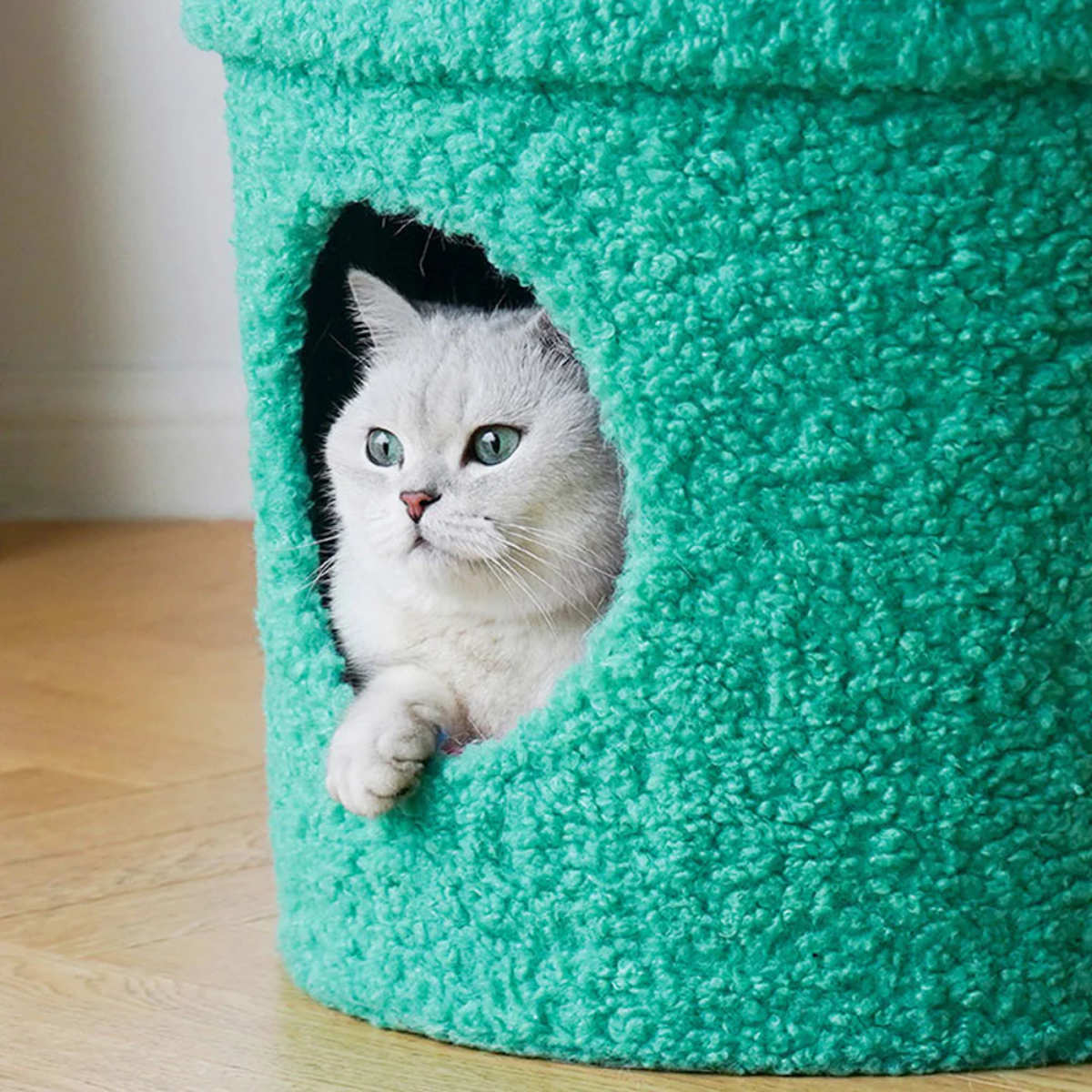 ポップなカラーがかわいい植木鉢型のキャットハウスです。おうちの中に入ったり、お花の上に登ったり、興味津々なねこちゃんの姿はなんともかわいいです。