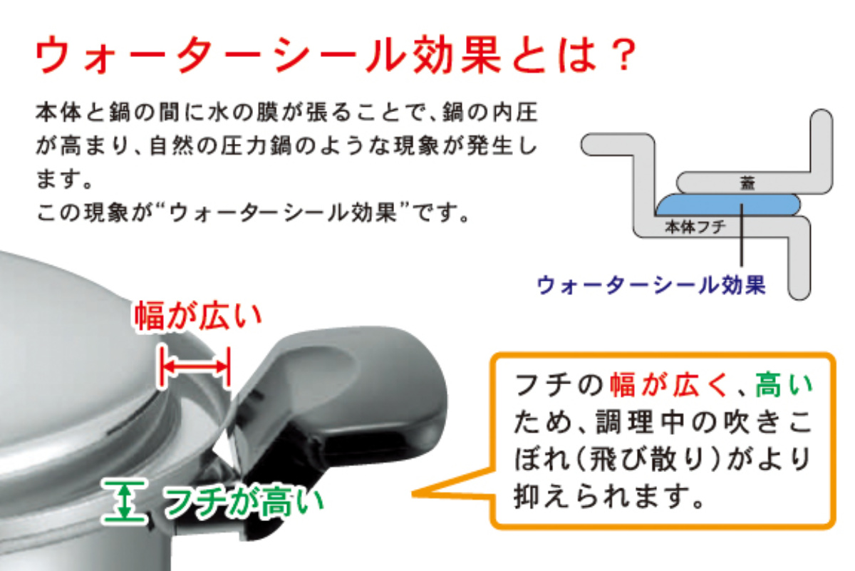 本体と蓋の間に水の膜が貼る「ウォーターシール効果」により内圧が高まり、圧力鍋のような調理ができる両手鍋です。調理時間の短縮が可能なうえ、沸騰後はトロ火で十分に調理ができるため、ガス代や電気代を大幅に節約できます。
