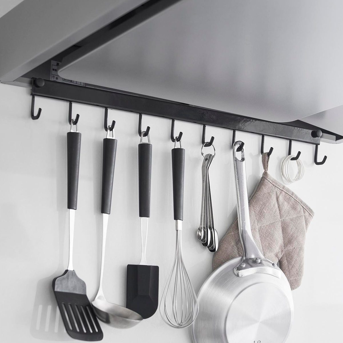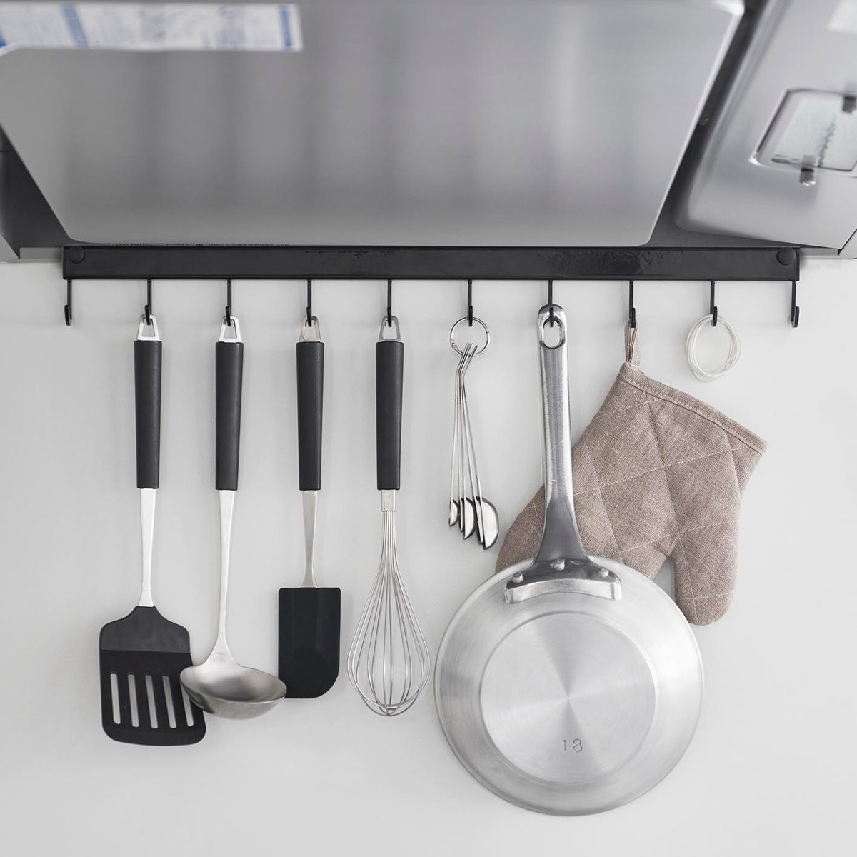 キッチンツールをコンロサイドに掛けておくと調理中の使いたい時にサッと手に取れて調理がスムーズに。キッチンツールの他にミトンや鍋敷、フライパンの収納も可能です。コンロの回りがすっきり片付いて調理スペースが広がり、掃除も簡単です。