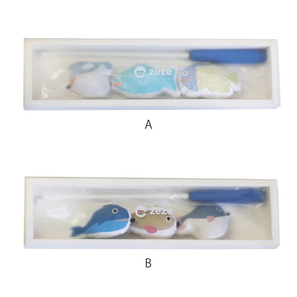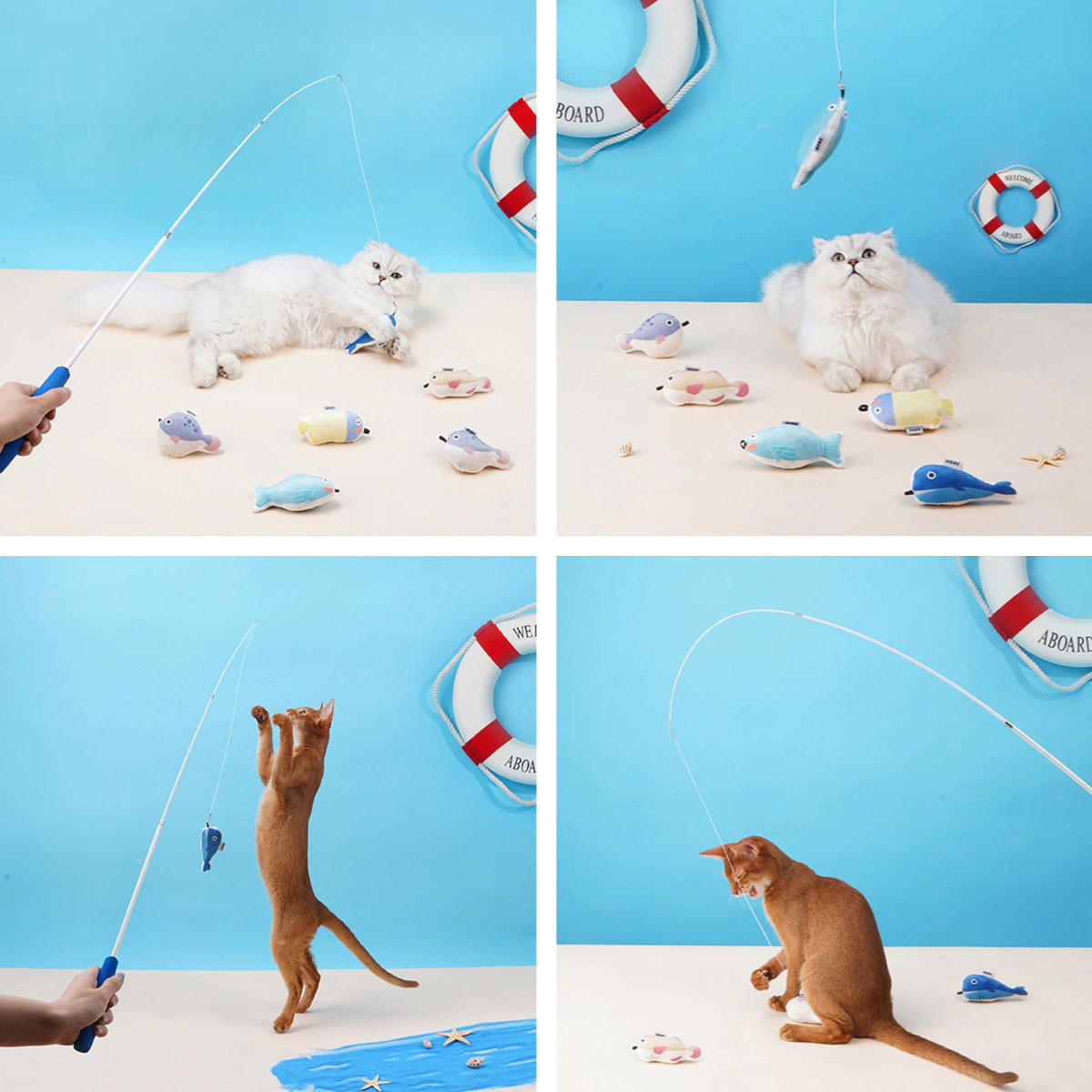 獲物を狙う猫ちゃんから、お魚を守るために右へ左へ、前へ後ろへ竿を動かしてゲームスタートです。猫ちゃんの狩猟本能をくすぐり、アクティブに遊んで運動不足を解消します。 竿1本とお魚マスコット3種類が入っていてすぐに遊べます。
