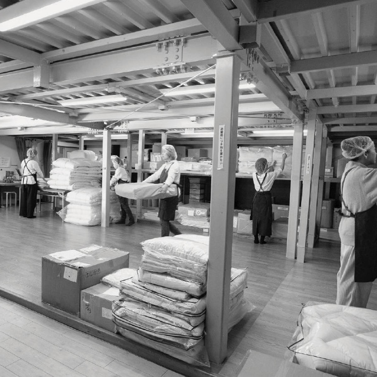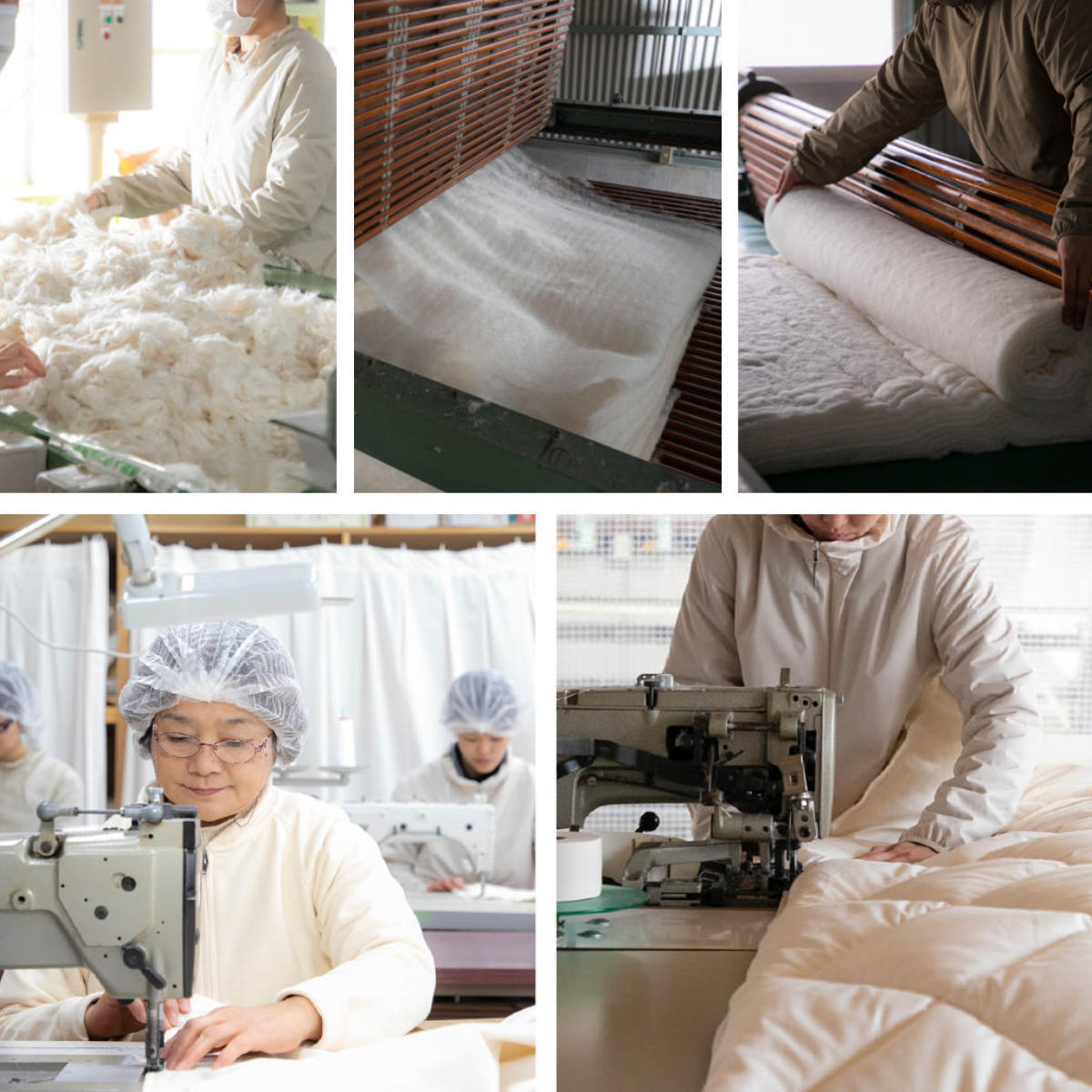 SaFoの商品は高知県大豊町の山間部にある工場で作られています。産地から届いた新鮮なオーガニックコットンを丁寧にほぐし、機械でふわふわに加工・成形、手作業で縫製加工や検査を行っています。