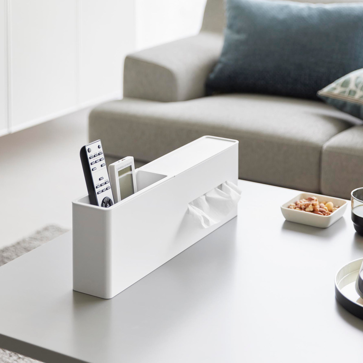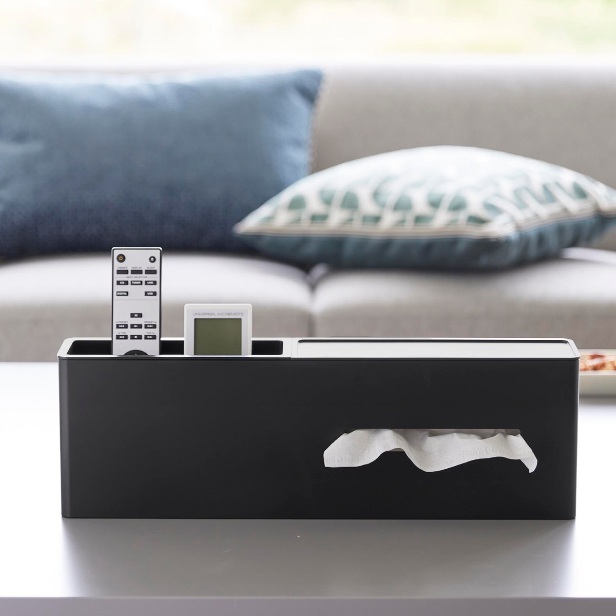 ティッシュケースの蓋はトレーにもなり、ベッドに棚がなくてもリモコンや眼鏡、スマホの一時置きとして便利に使えます。