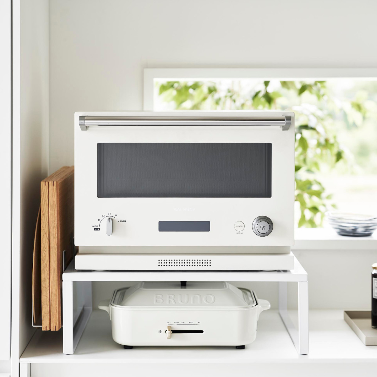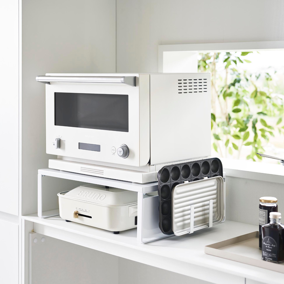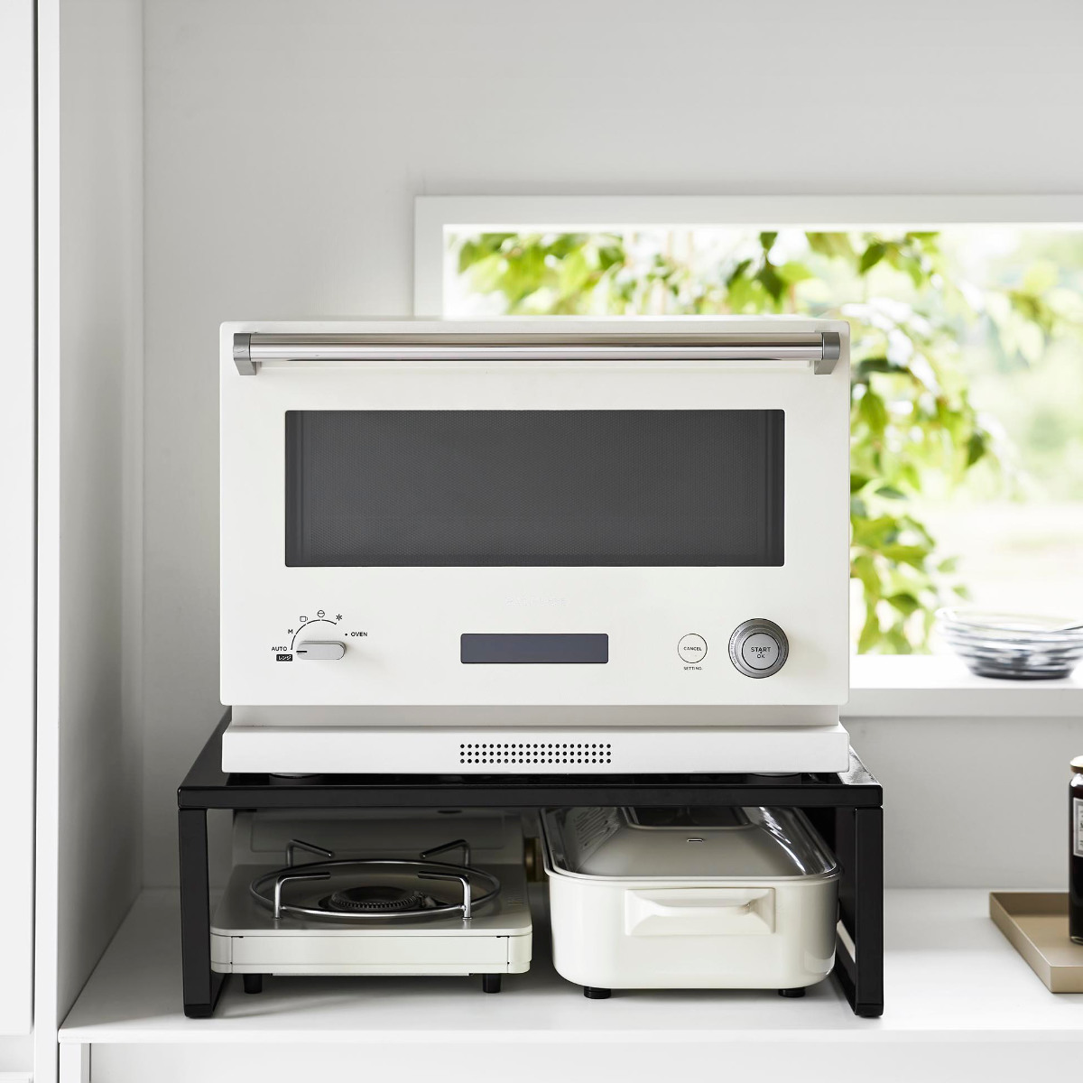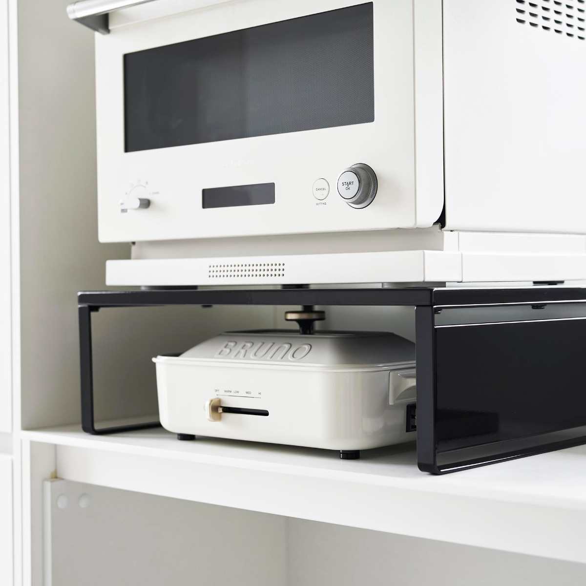 オーブンレンジの下に収納スペースが作れるラックです。かさばって置き場所に困るホットプレートやカセットコンロの収納場所におすすめです。