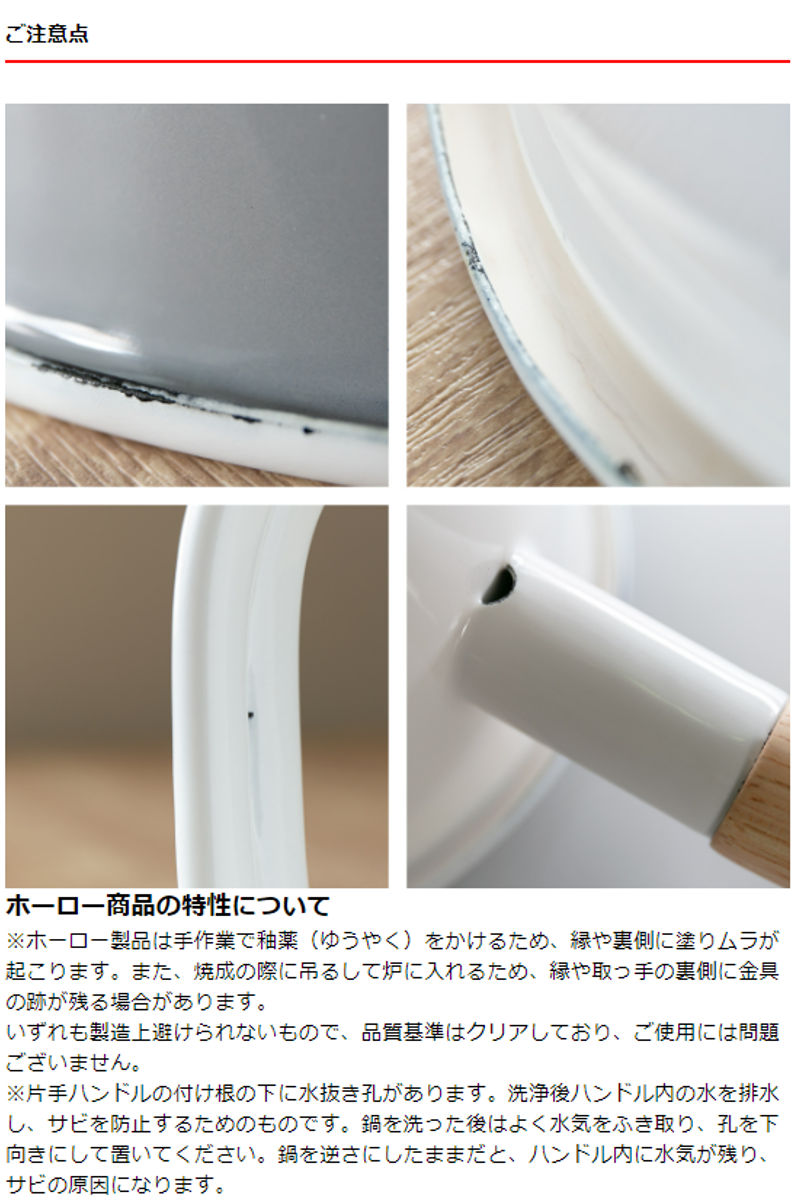 ※ホーロー製品は手作業で釉薬(ゆうやく)をかけるため、縁や裏側に塗りムラが起こります。また、焼成の際に吊るして炉に入れるため、縁や取っ手の裏側に金具の跡が残る場合があります。