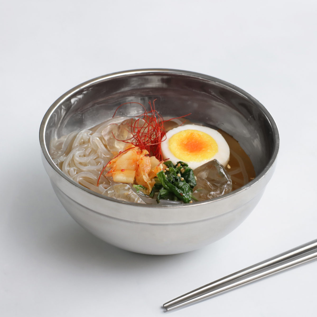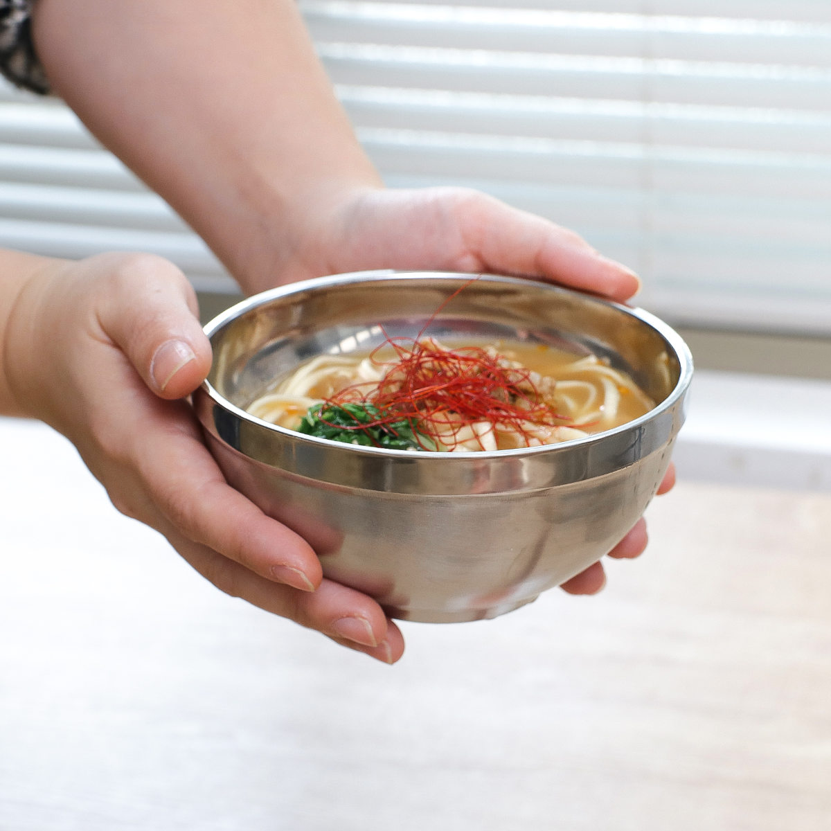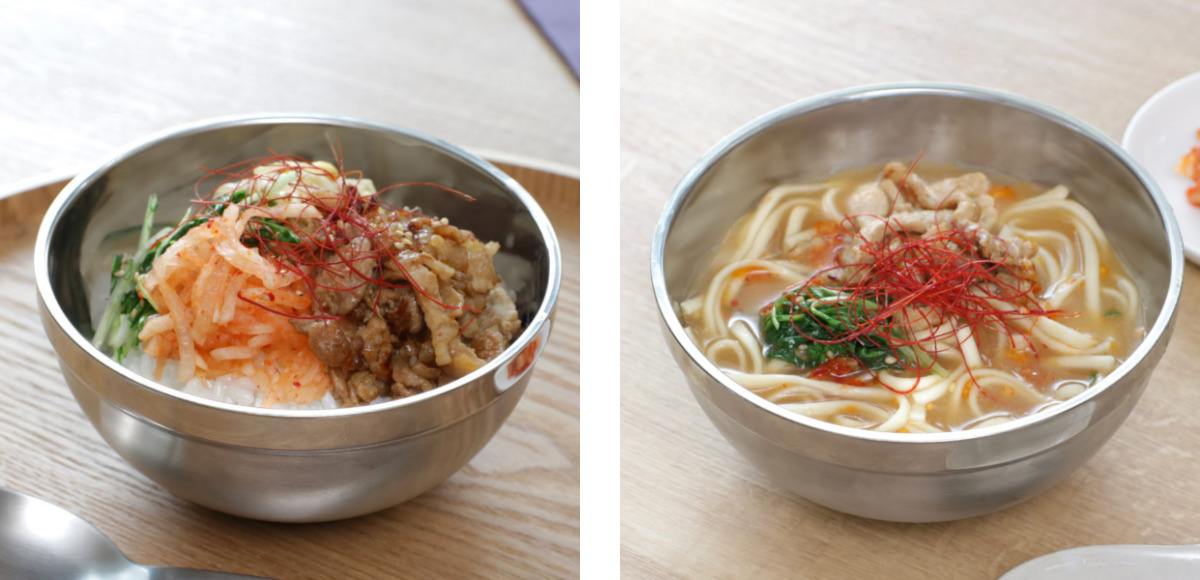 韓国風の料理が楽しめるステンレス製の丼ぶりです。二重構造なので熱が器に伝わりにくく、外気温の影響を受けにくいので一定程度の保温効果があります。あたたかい食べ物は冷めにくく、冷たい冷麺などもぬるくなりくいです。
