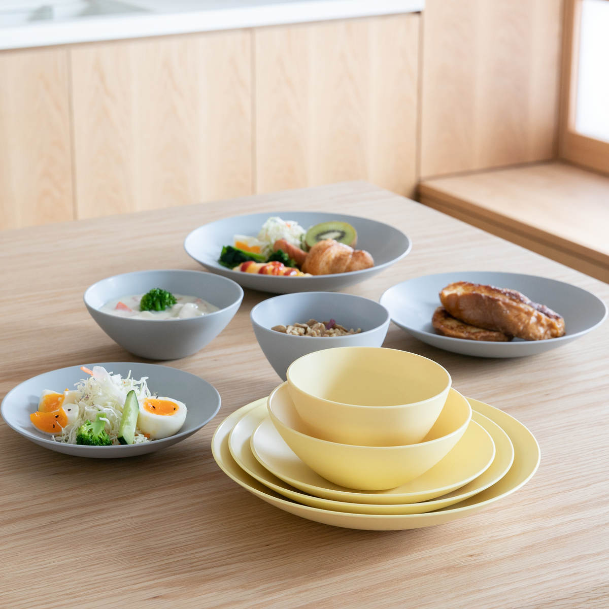 お米由来の国産バイオマスプラスチック「ライスレジン(R)」で作られた地球に優しい食器シリーズ「ほわり」。古米や廃棄米を使用することによって持続可能な社会への貢献にも繋がります。豊富なカラーリングと、陶器にも遜色ないフォルムが魅力です。