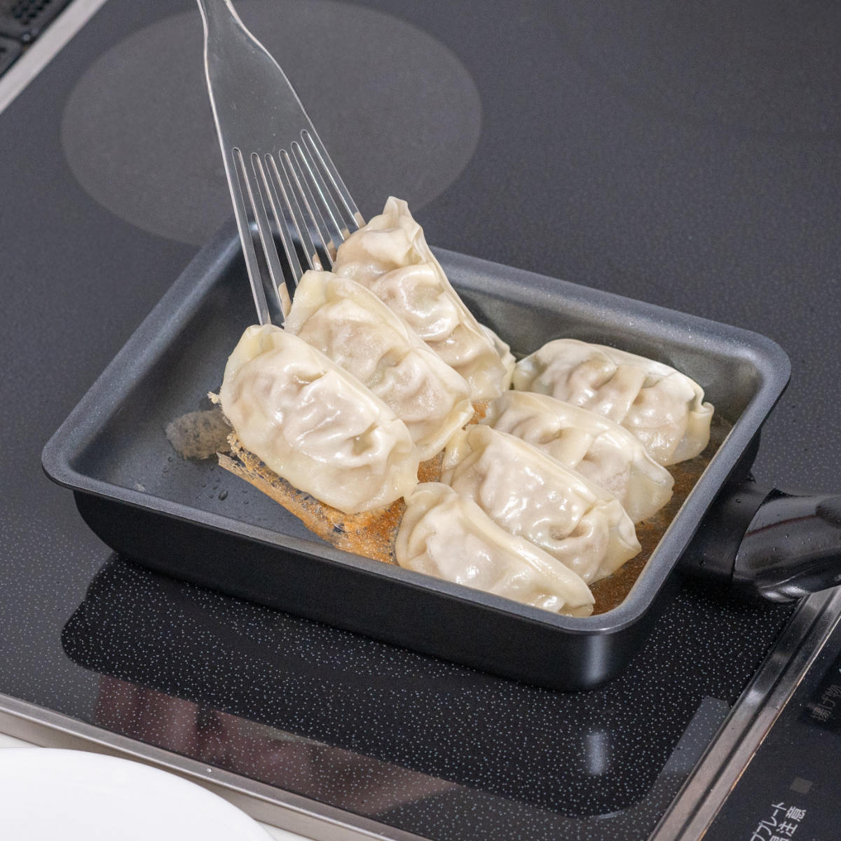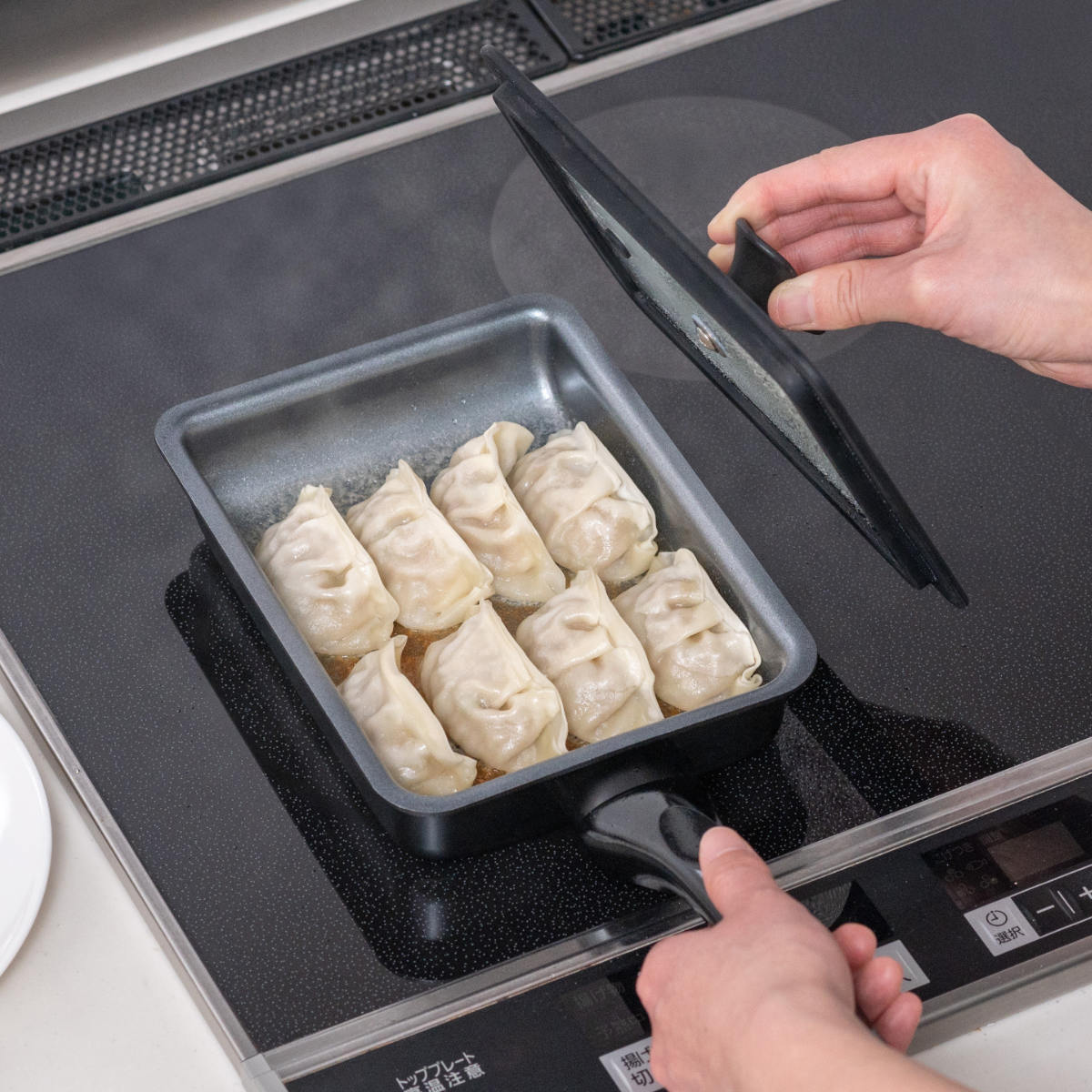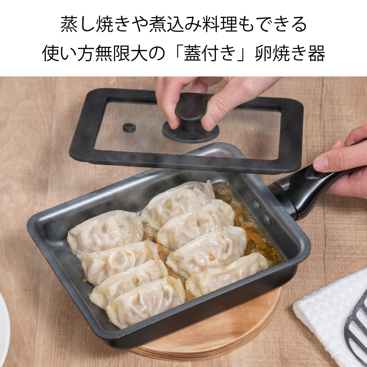 朝食やお弁当のおかず作りにぴったりな玉子焼き器は、フタを使用することでさらに活躍の幅が広がります。1~2人分の焼き餃子や野菜の蒸し焼き、じっくり火を通したいハンバーグなどの調理にも最適で、ふっくらと美味しく仕上がります。