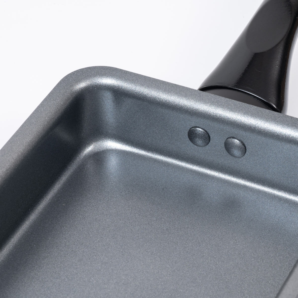 内面のコーティングには、日本のオキツモ(株)社開発のフッ素樹脂加工を採用しました。耐摩耗性テストを200万回クリアしており、金属ヘラの使用も可能です。食材がこびりつきにくく、快適に調理できます。