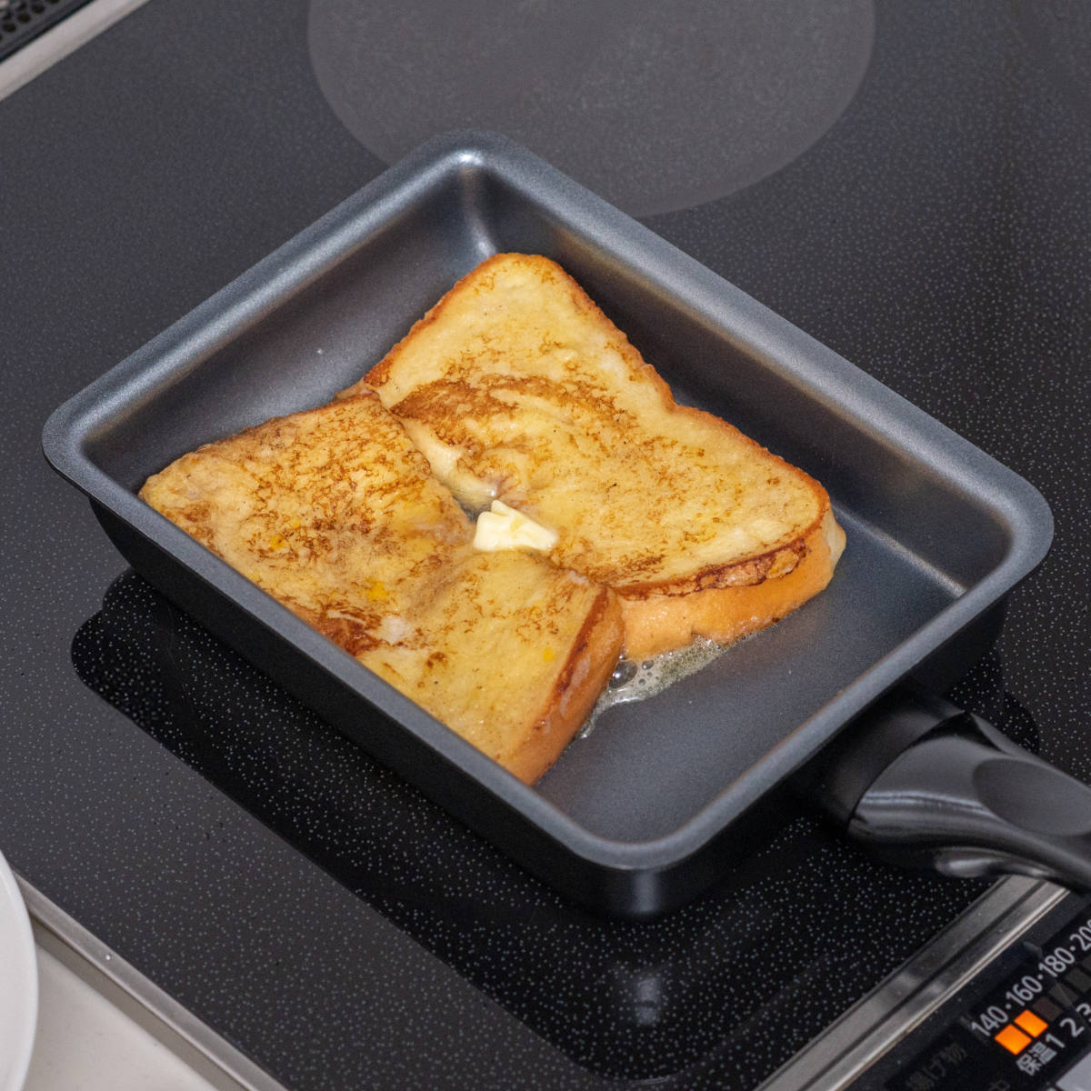 従来の卵焼き器よりも少し深いので、卵焼きやだし巻きがたっぷり作れます。分厚い卵焼きを使って、関西風たまごサンドもご家庭でお楽しみいただけます。