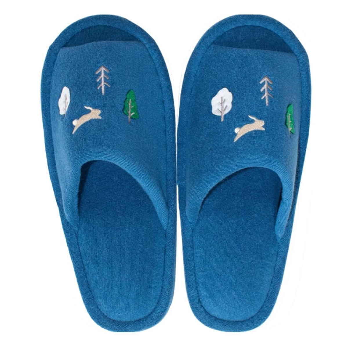 「ナタルシーナリー」シリーズのトイレスリッパです。刺繍とアップリケを組み合わせて描いた風景やウサギの刺繍がかわいらしく、ルームシューズとしてもお使いいただけます。