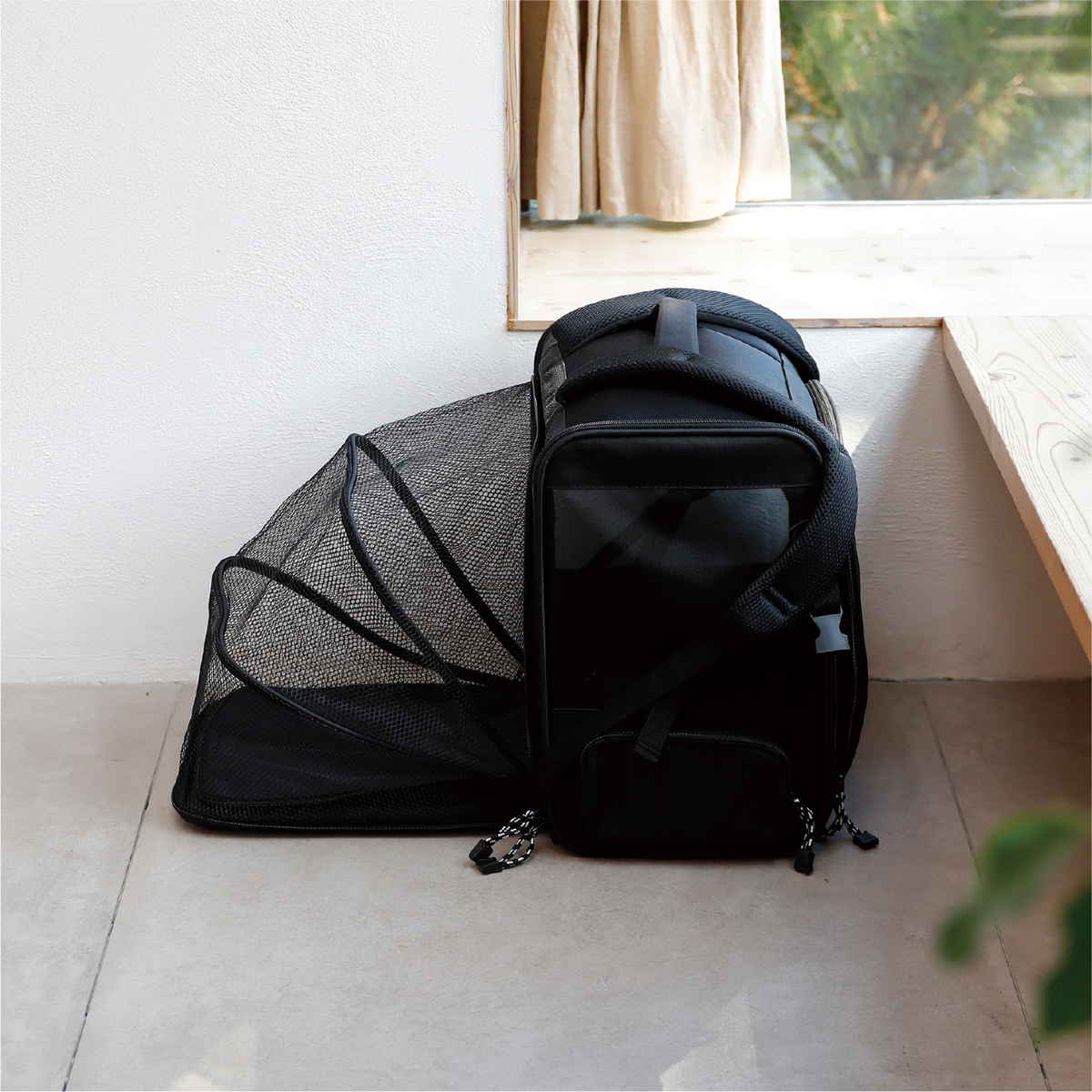 ペットと飼い主が共に過ごす時間をより特別なものにするために考えられたペットリュックです。ブラックを基調にしつつ、鮮やかなカラーリングで個性を際立たせるデザインに、機能性にも優れたこだわりのアイテムです。