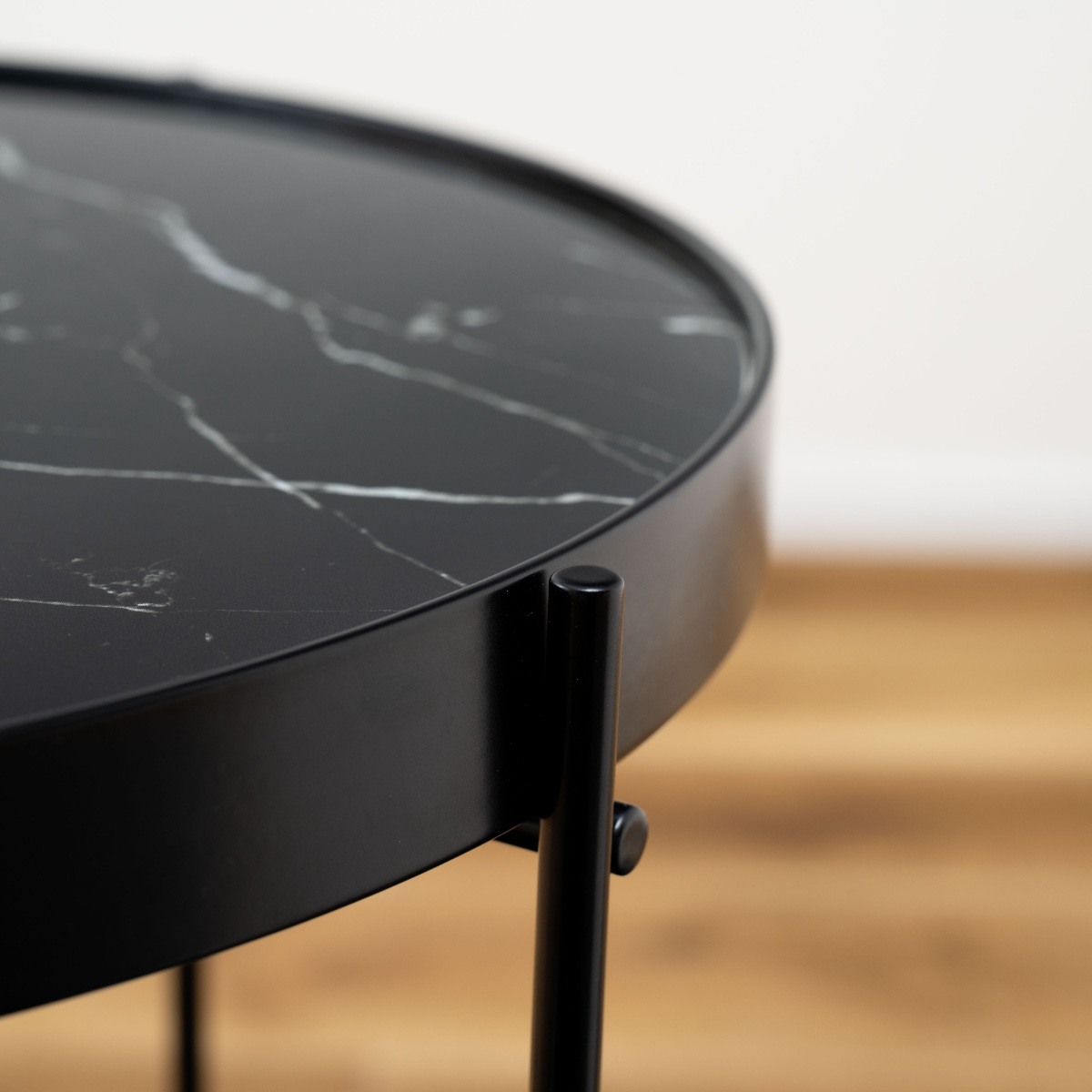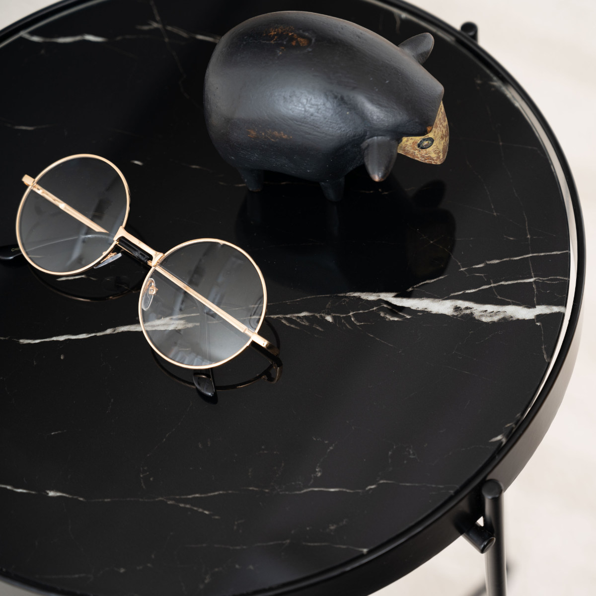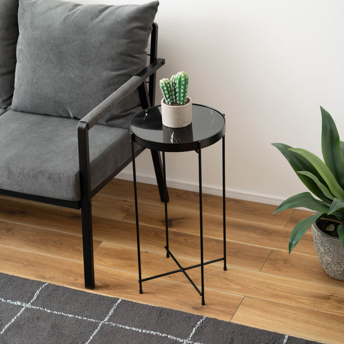 サイドテーブル 円型 高さ60.5cm 石目調 ( 丸 ラウンド ハイタイプ ガラス 天板 ナイトテーブル ミニテーブル ソファ ベッド 横 スチール 軽量 軽い ブラック 黒 高級感 シンプル おしゃれ モダン )