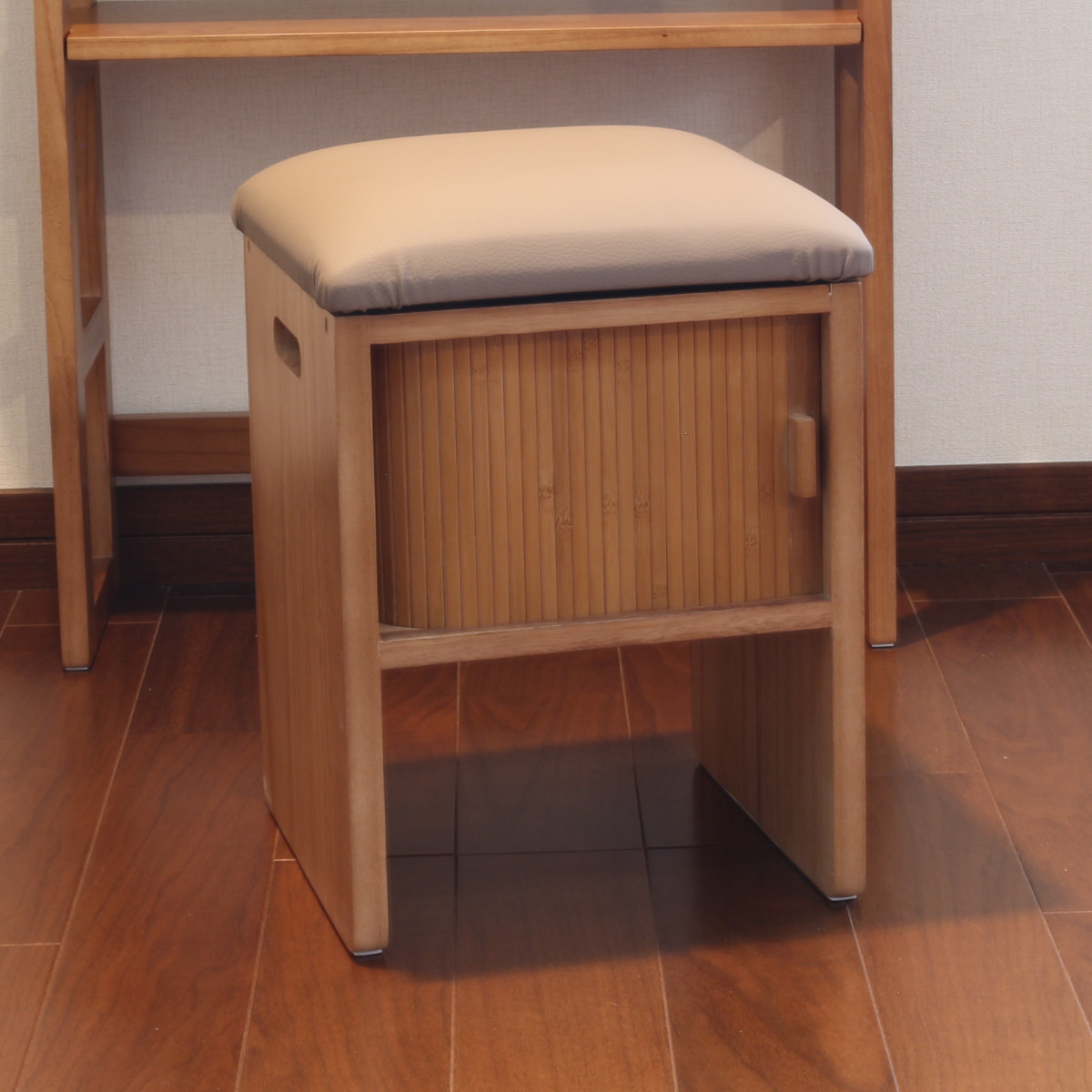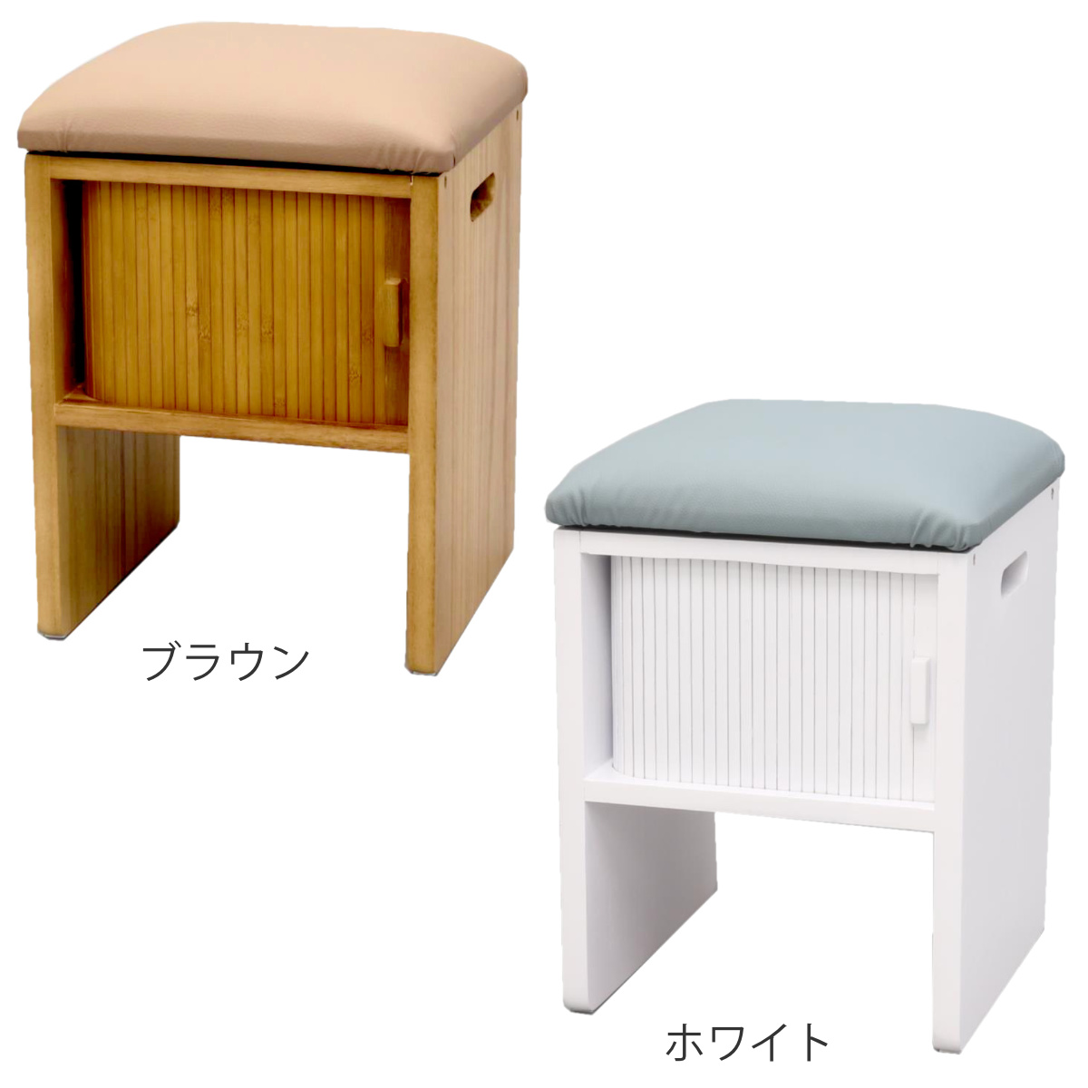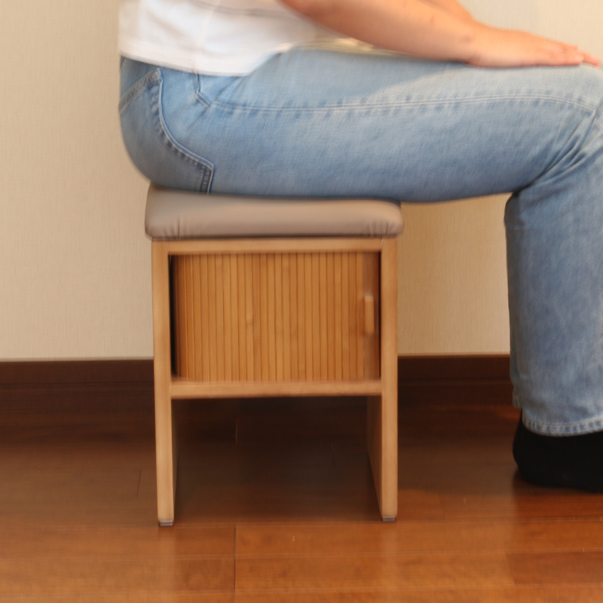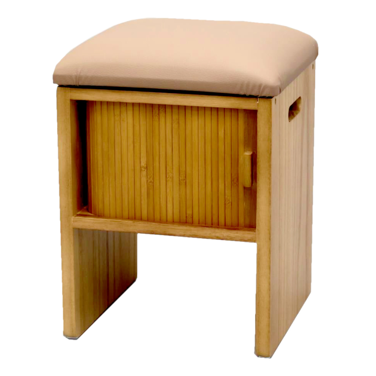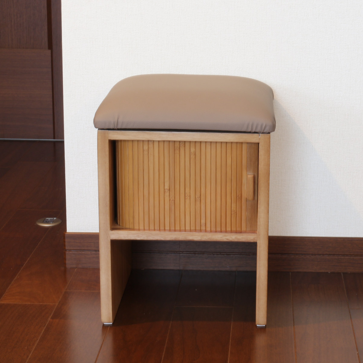 竹製のジャバラ扉がついた収納スペース付きスツールです。扉が横にスライドするので狭い場所でも開閉できます。座れて収納もついてコンパクト設計でどんな場所でも大活躍。