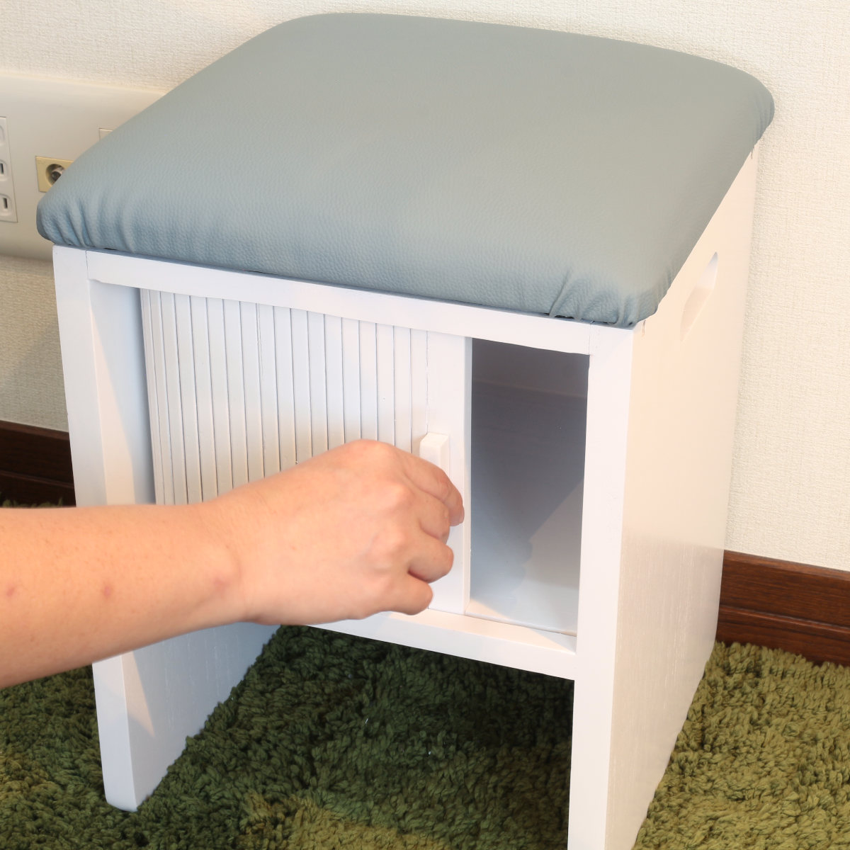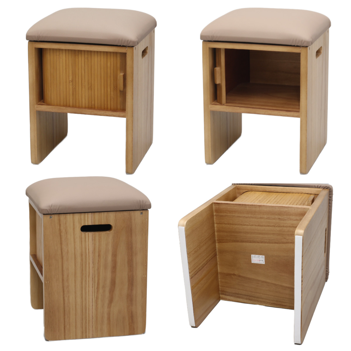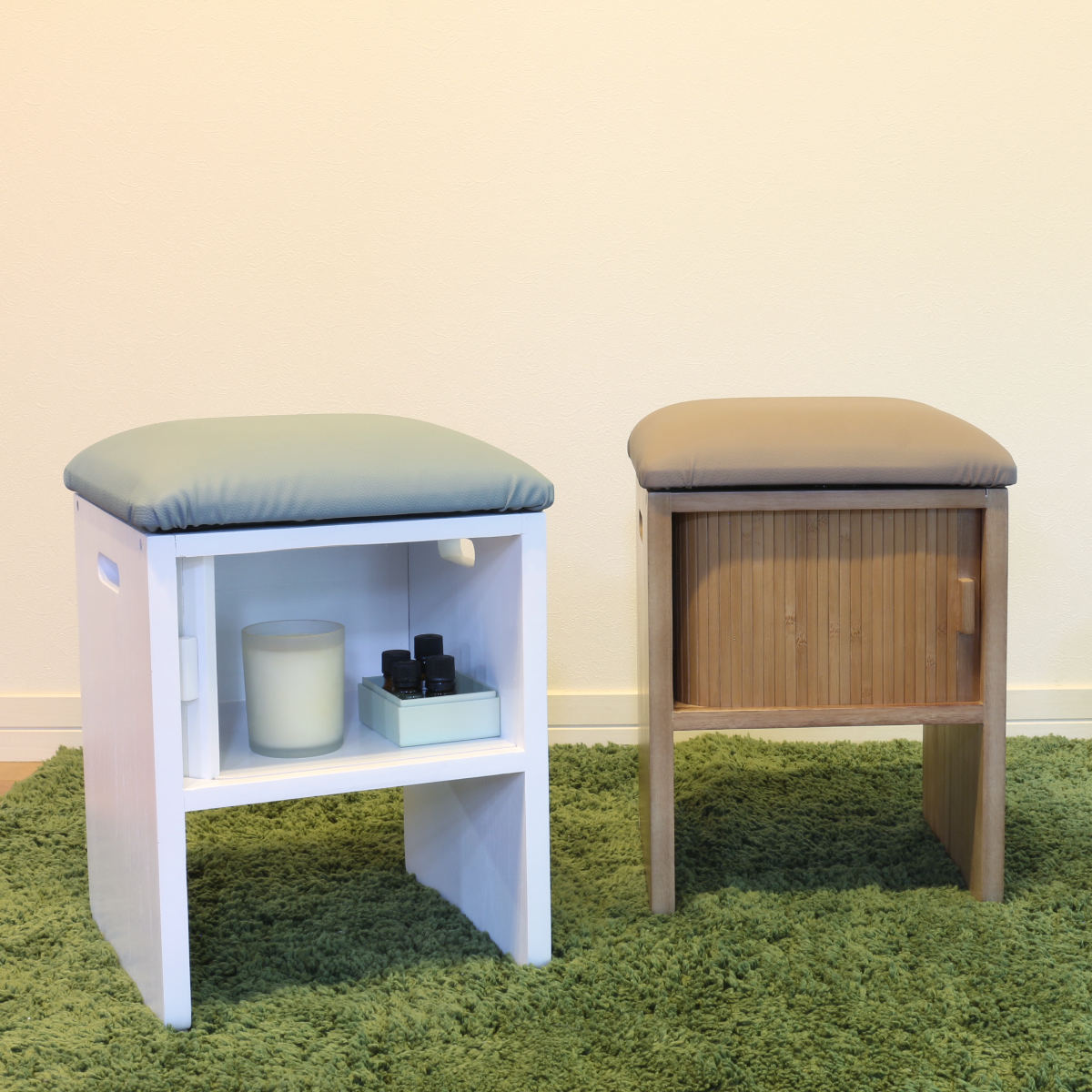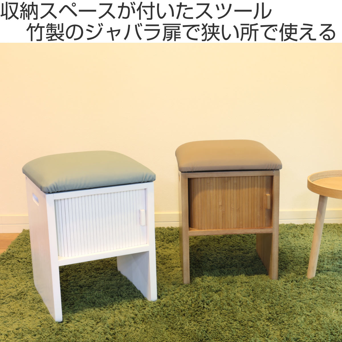 竹製のジャバラ扉がついた収納スペース付きスツールです。扉が横にスライドするので狭い場所でも開閉できます。座れて収納もついてコンパクト設計でどんな場所でも大活躍。