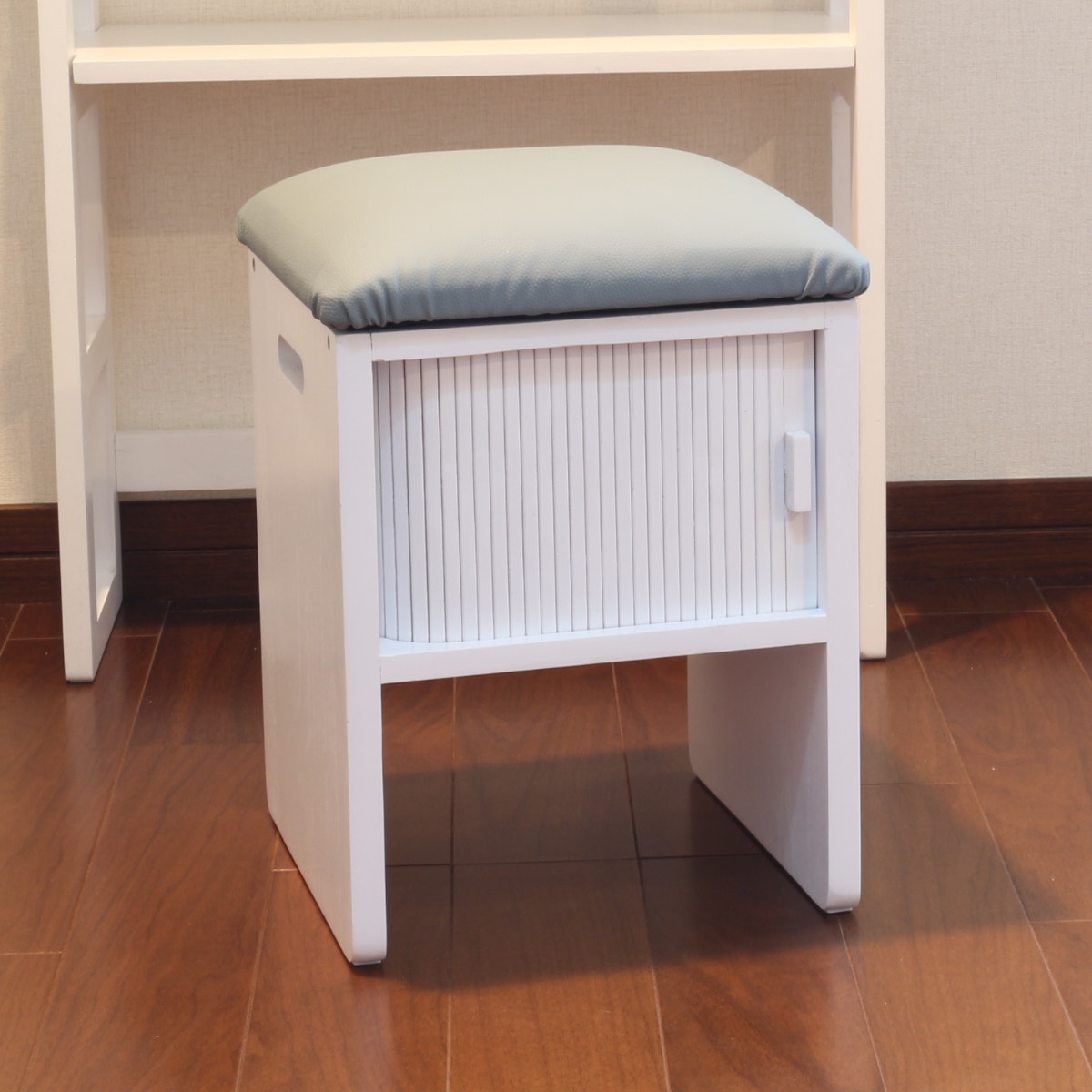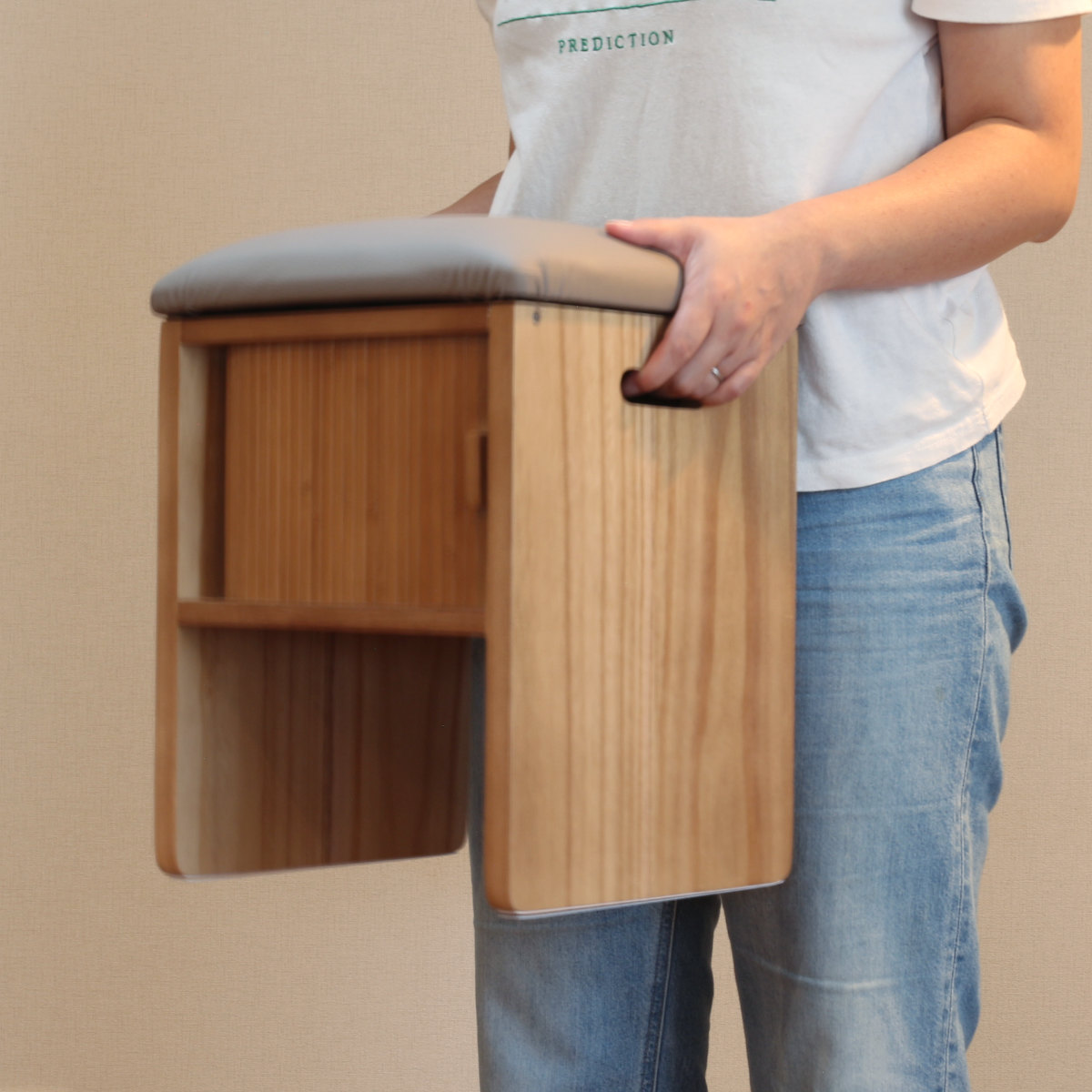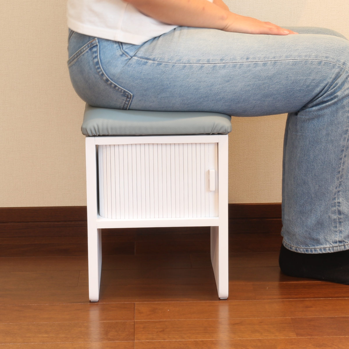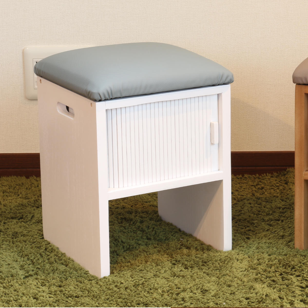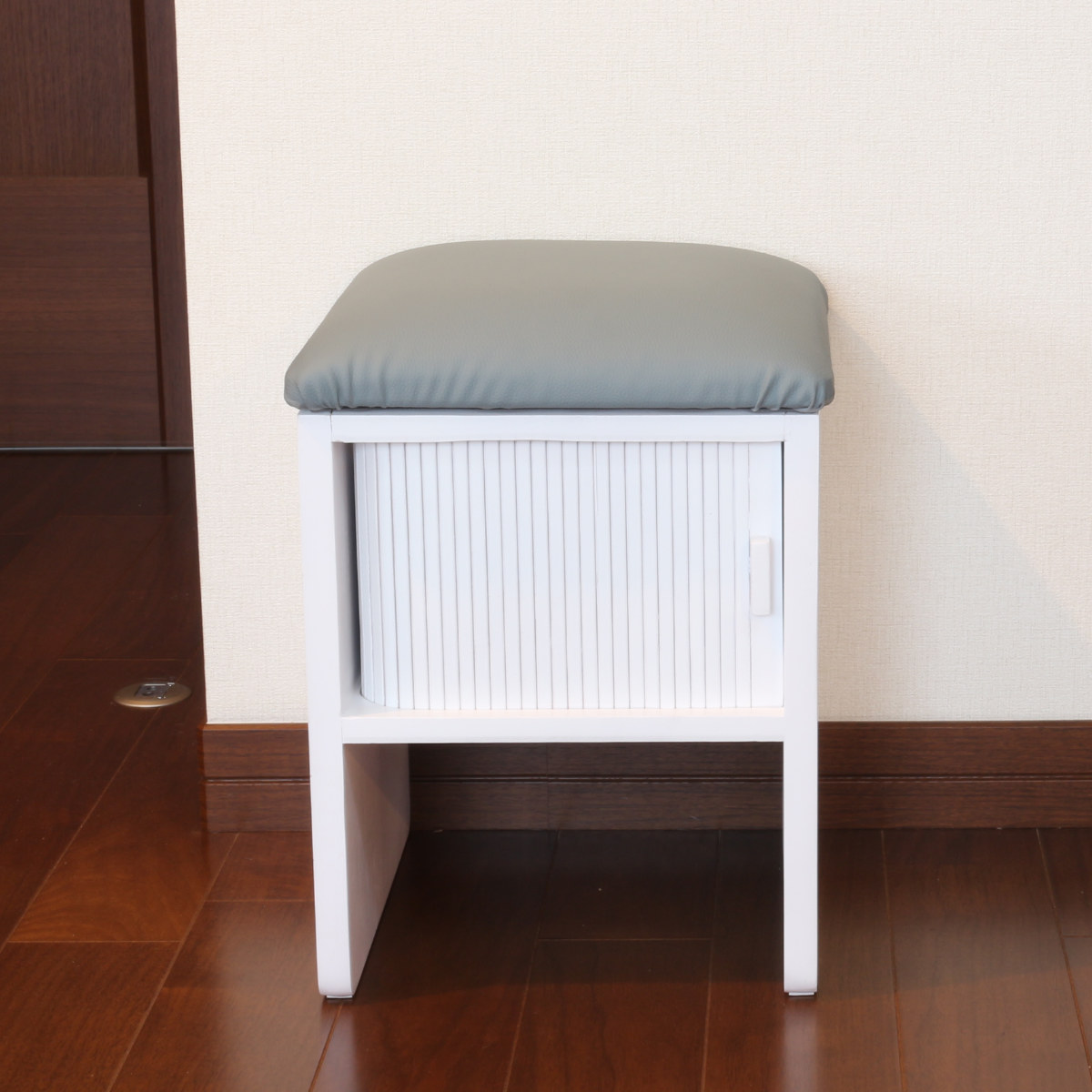竹製のジャバラ扉がついた収納スペース付きスツールです。扉が横にスライドするので狭い場所でも開閉できます。座れて収納もついてコンパクト設計でどんな場所でも大活躍。