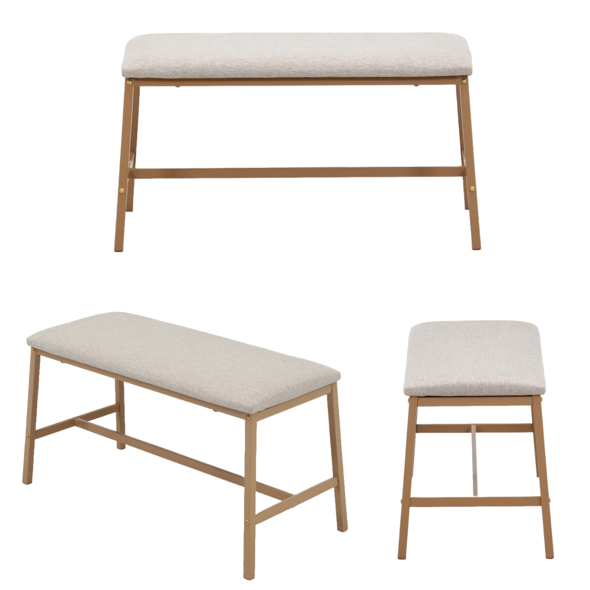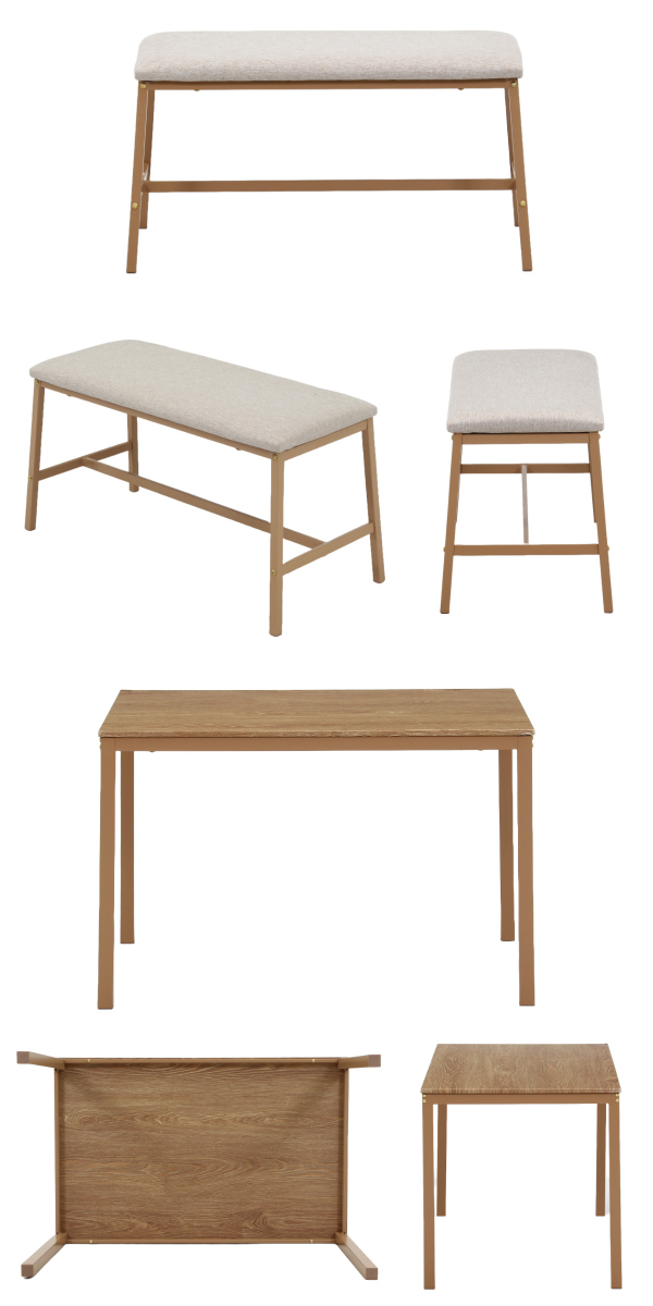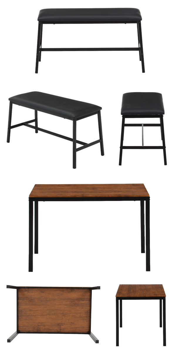 | 材質 | テーブル天板:MDF、PVCシート テーブルフレーム・チェアフレーム・ベンチフレーム:金属(鋼) チェア・ベンチ座面:PVC(ビンテージ)、ポリエステル(ベージュ) |