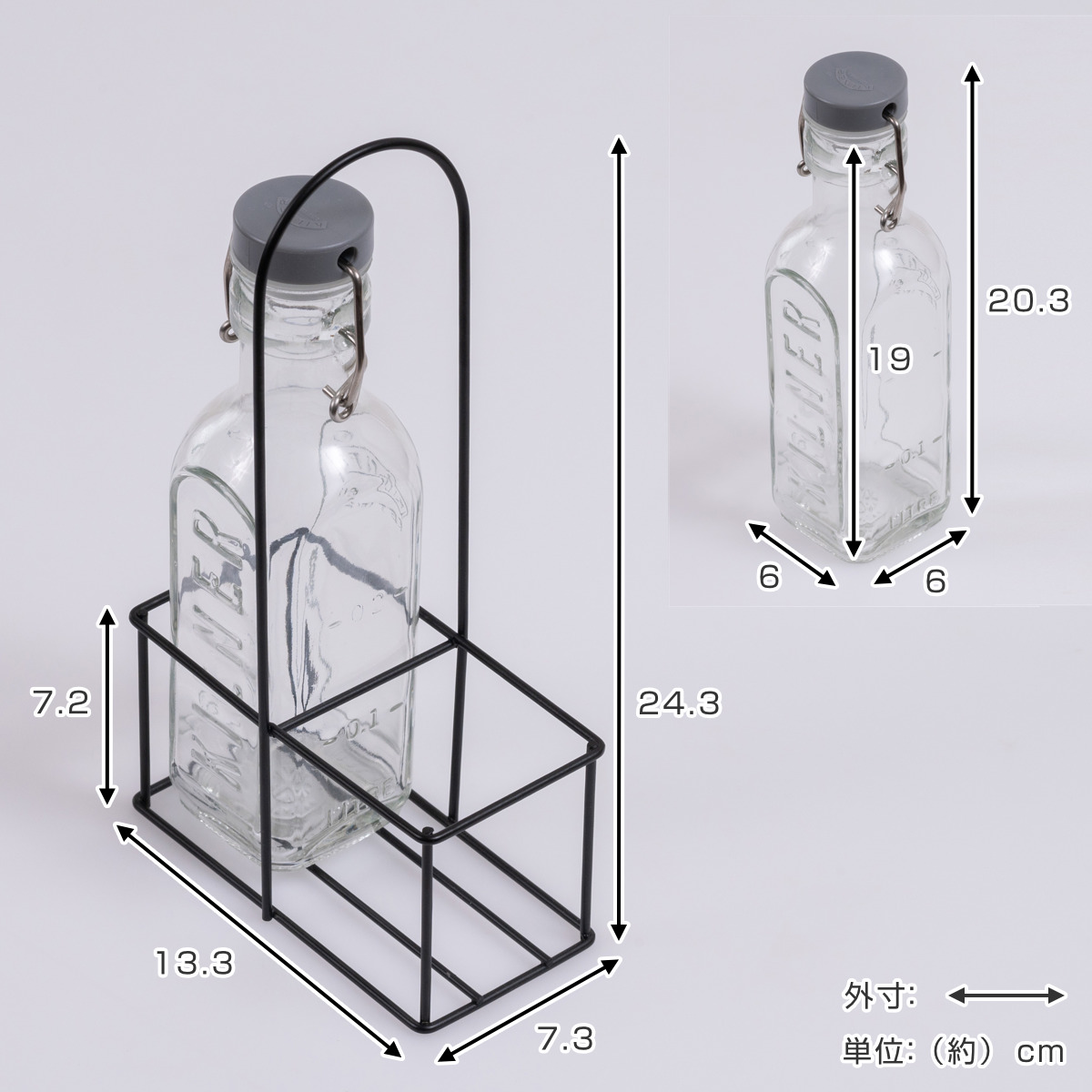 ●ガラスのオイルボトル(フタ付き)2個とラックがセットになった商品です。