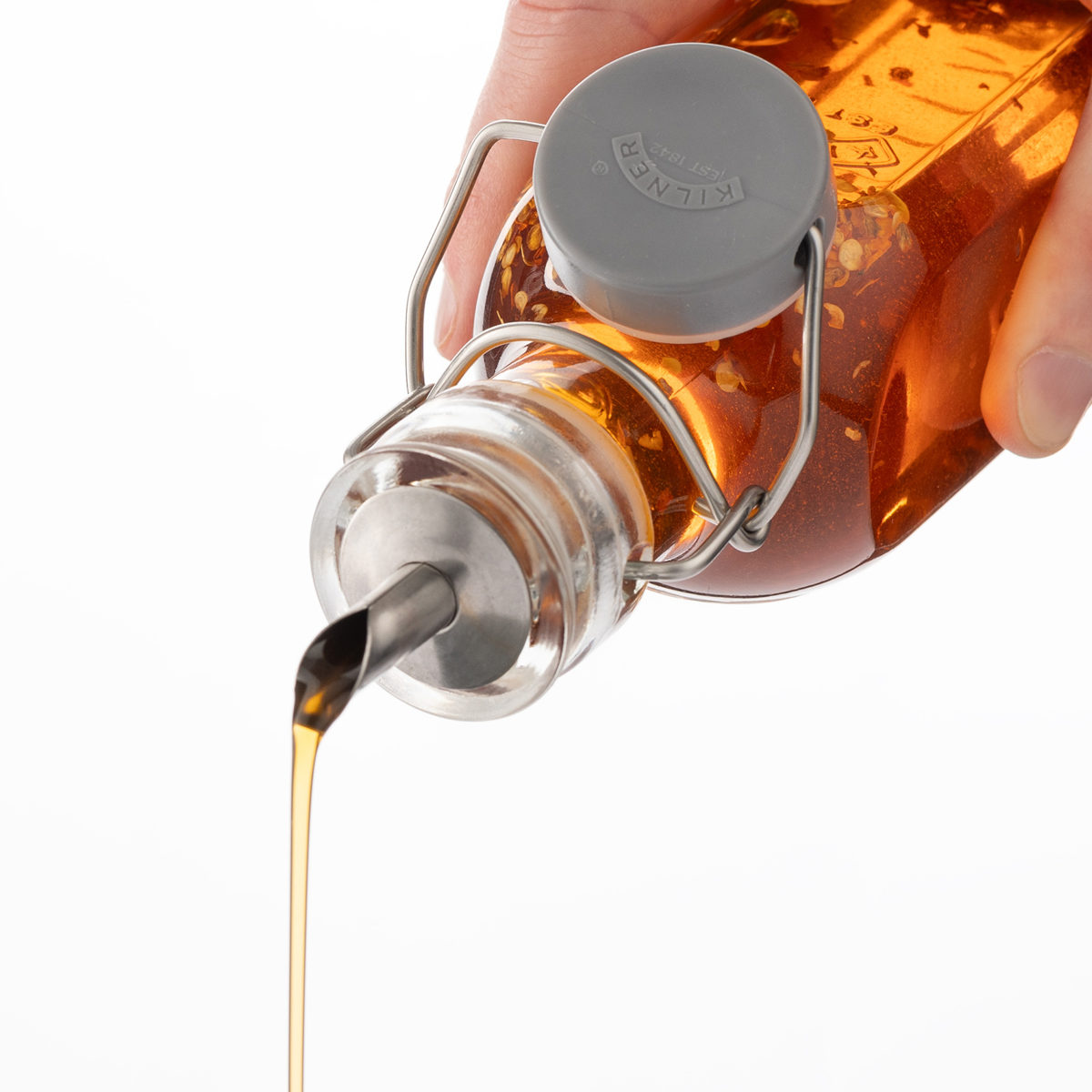 本体ボトルは、色やニオイが付きにくいソーダガラス製です。プラスチック製と比べて、香りの強いガーリックやハーブ類を入れても、ニオイ移りの心配もありません。油汚れも簡単に落とせるので、長く衛生的に使用できます。
