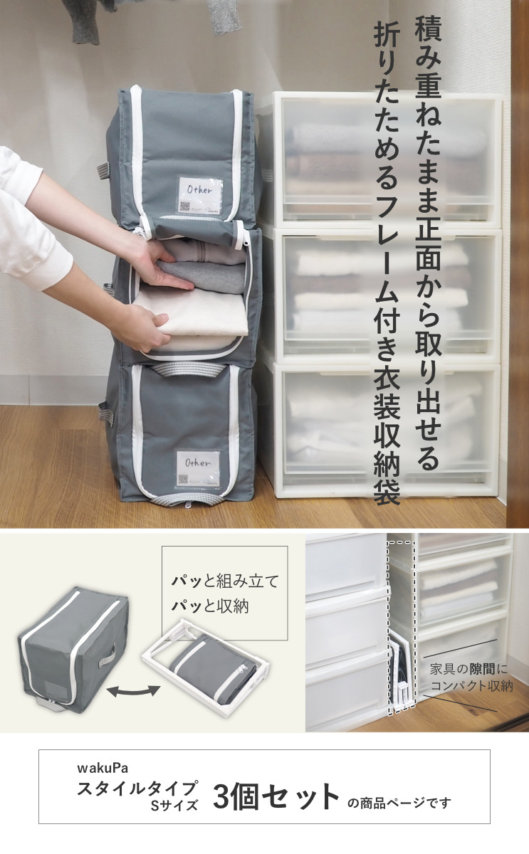収納ボックス 3個セット 衣類収納 フレーム付き ワクパ スタイル S 幅22×奥行39×高さ23cm ( 折りたたみ 衣類収納袋 衣類収納ボックス 収納 収納ケース 洗濯 丈夫 衣替え 押入れ収納 クローゼット収納 整理整頓 前開き 積み重ね )