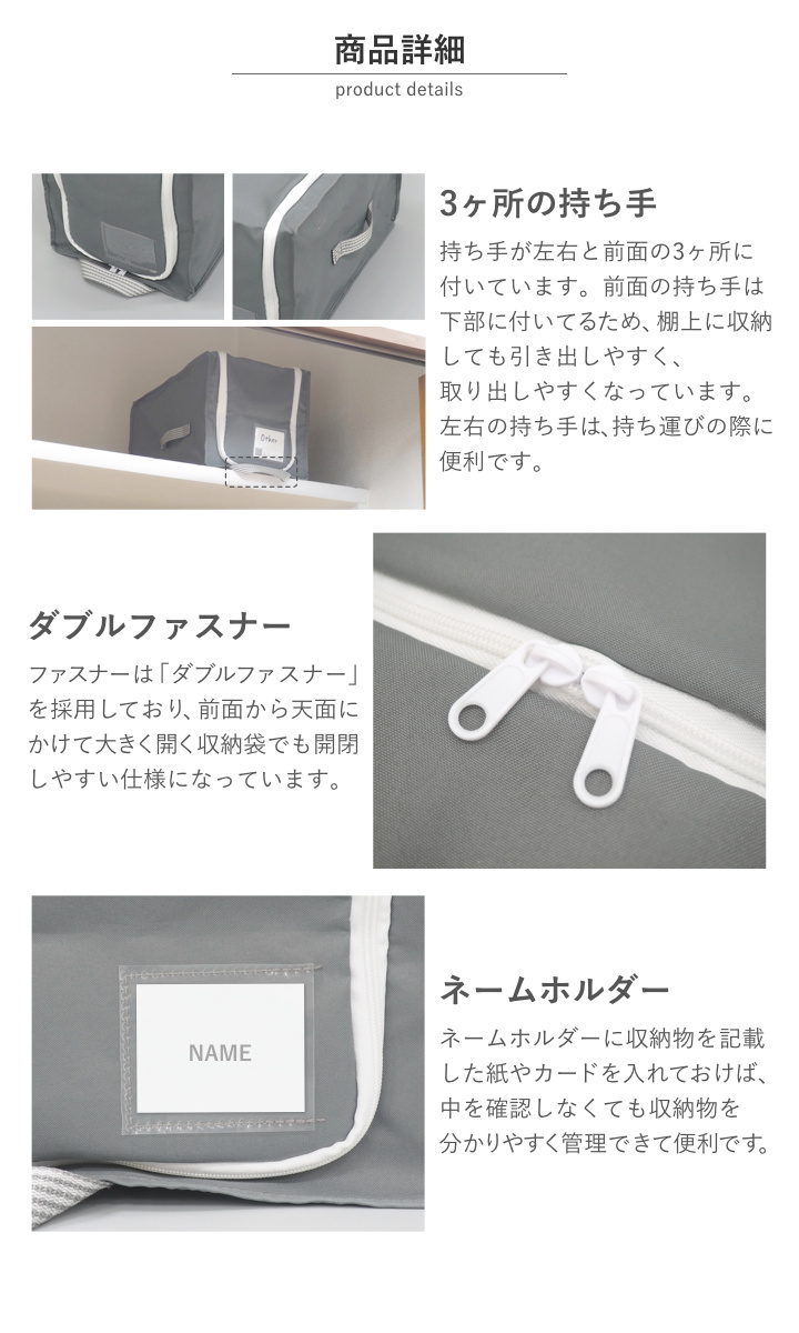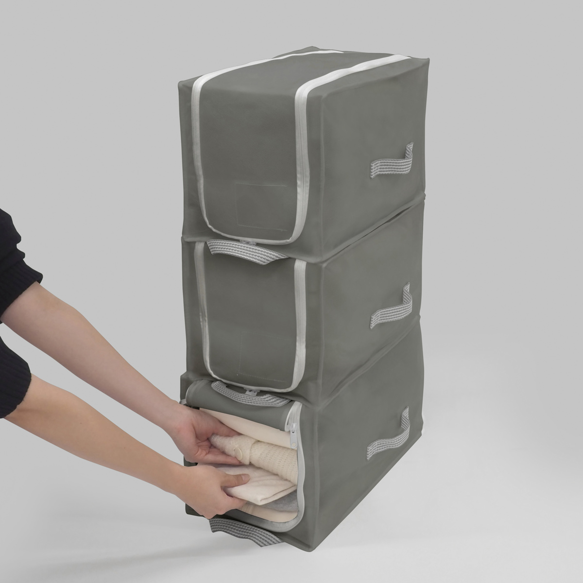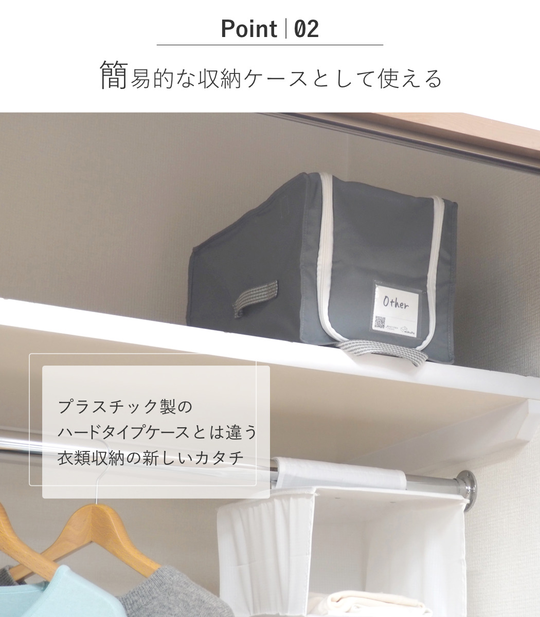 従来の不織布製の柔らかい収納袋の一面を持ちつつも、収納ケースのように積み重ねての使用を可能にした新形態の衣類収納袋です。