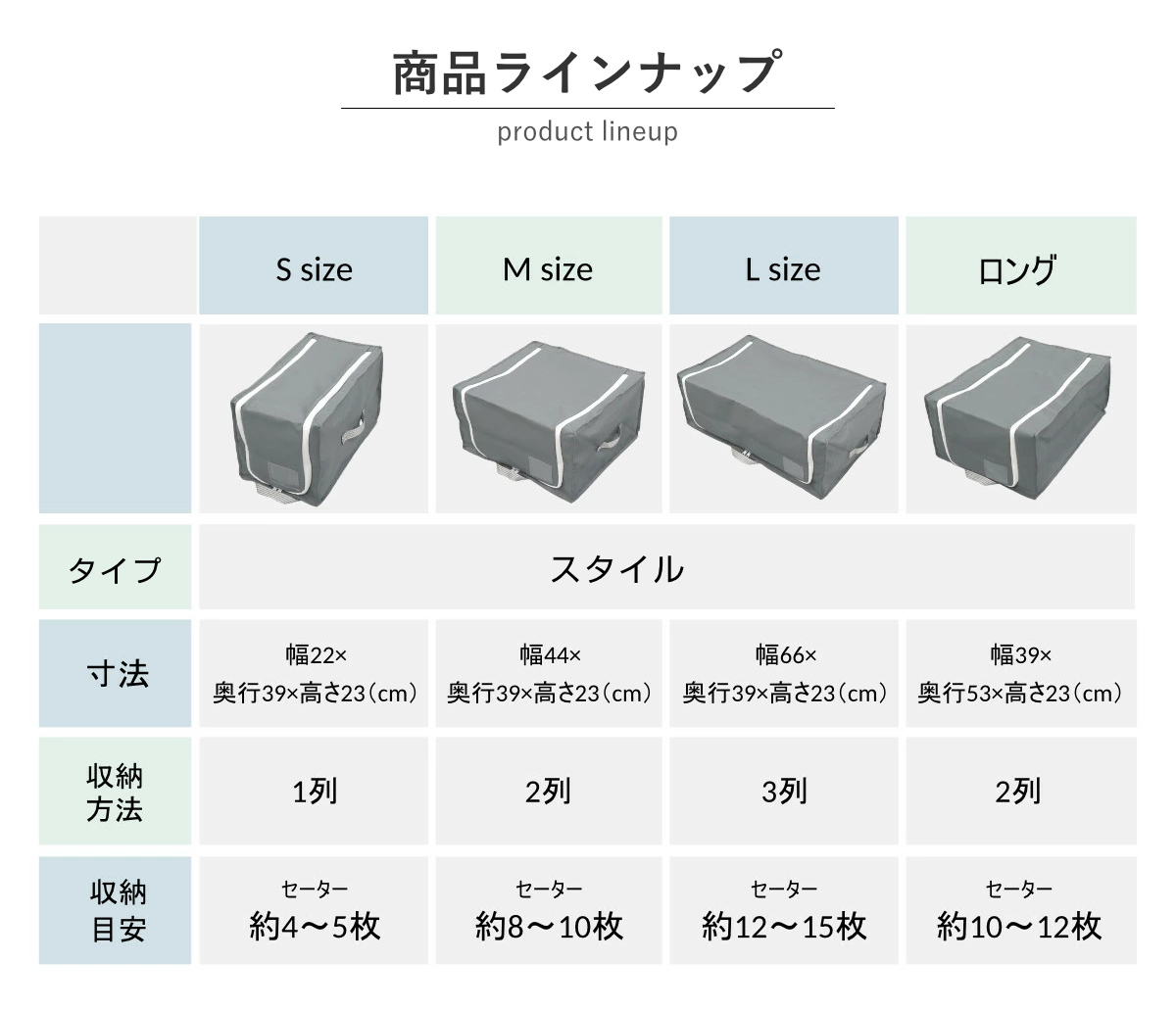 収納袋が洗える「スタイルタイプ」は、それぞれS・M・L・ロングの4サイズ展開しています。豊富なラインナップから収納容量やクローゼットに合わせてぴったりのサイズを見つけることができます。