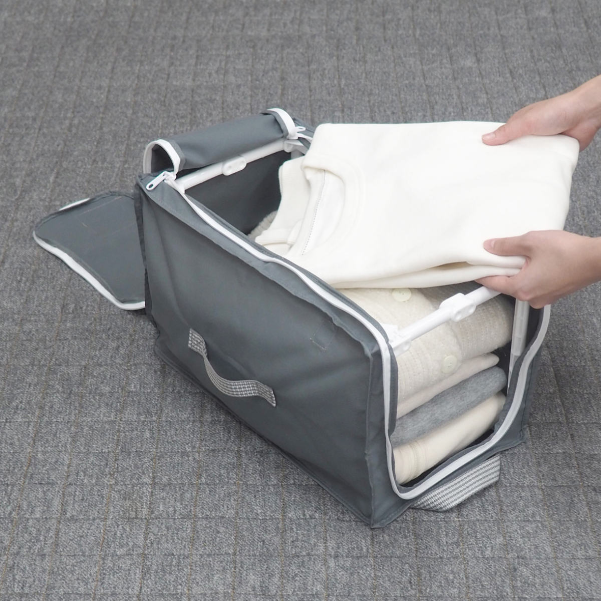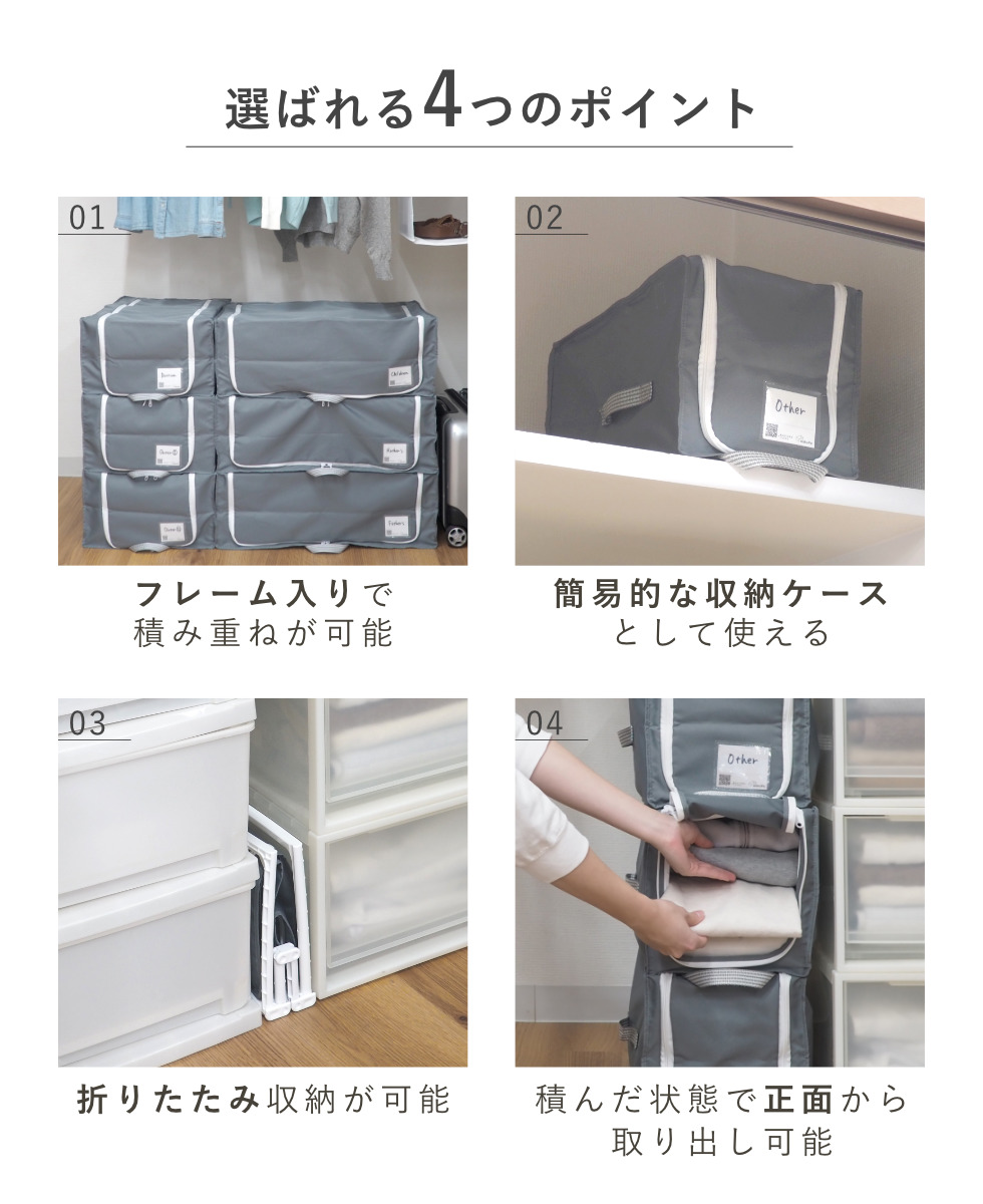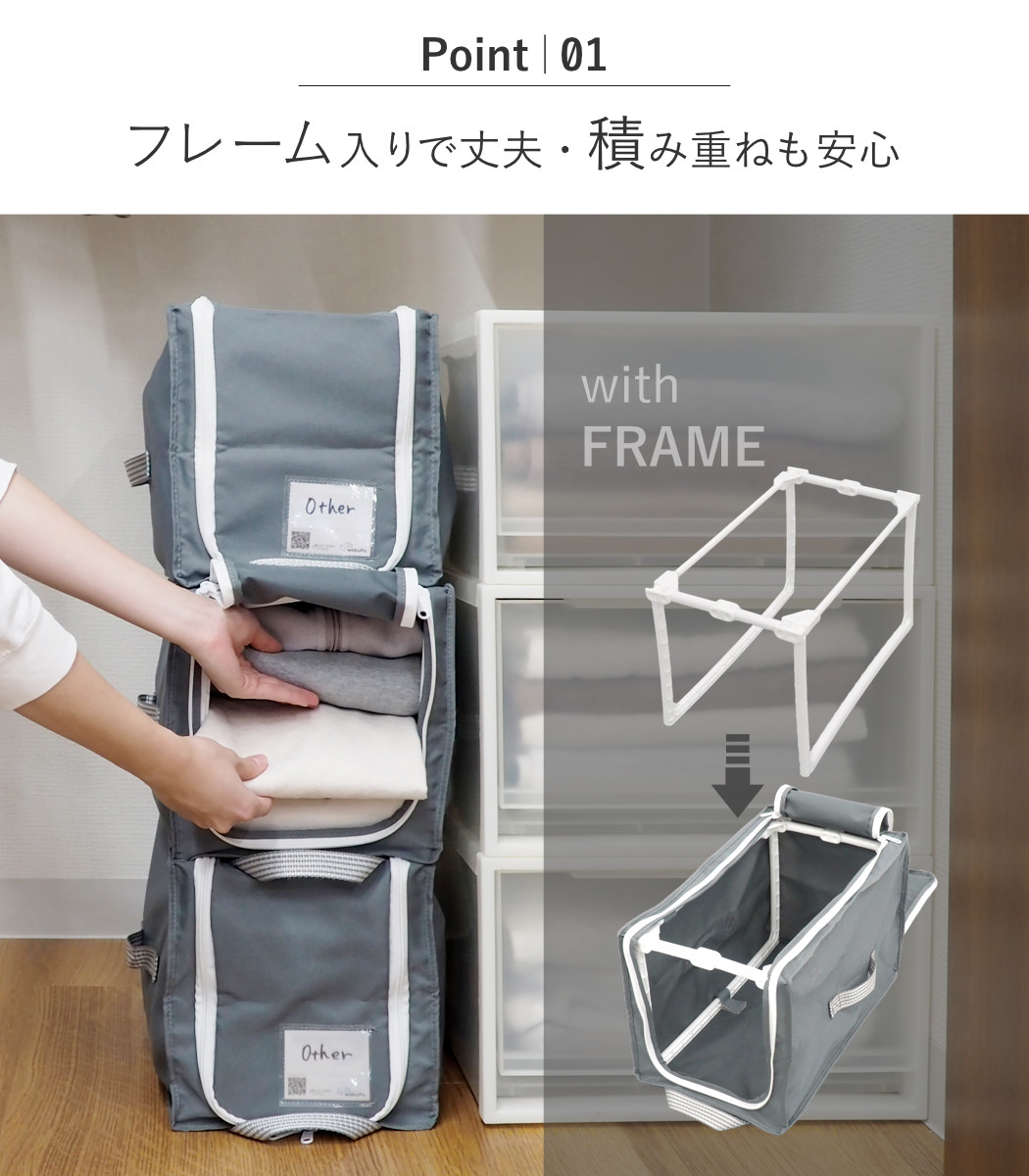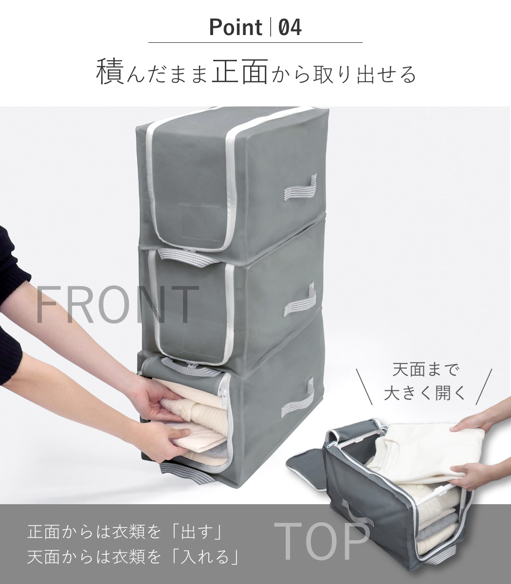 生地製の収納袋は積み重ねると重みでぐちゃっとつぶれて見た目が悪くなり、衣類を取り出す際も上に載っている収納袋をよける必要がありますが、wakuPa(ワクパ)はフレーム付きなので積み重ねても下が潰れることなく形状を維持してくれます。そのため、積み重ねた状態でも前面が開くので下段であっても衣類の取り出しが簡単に行えます。フタは前面から天面にかけてガバっと開くので、出し入れもスムーズです。