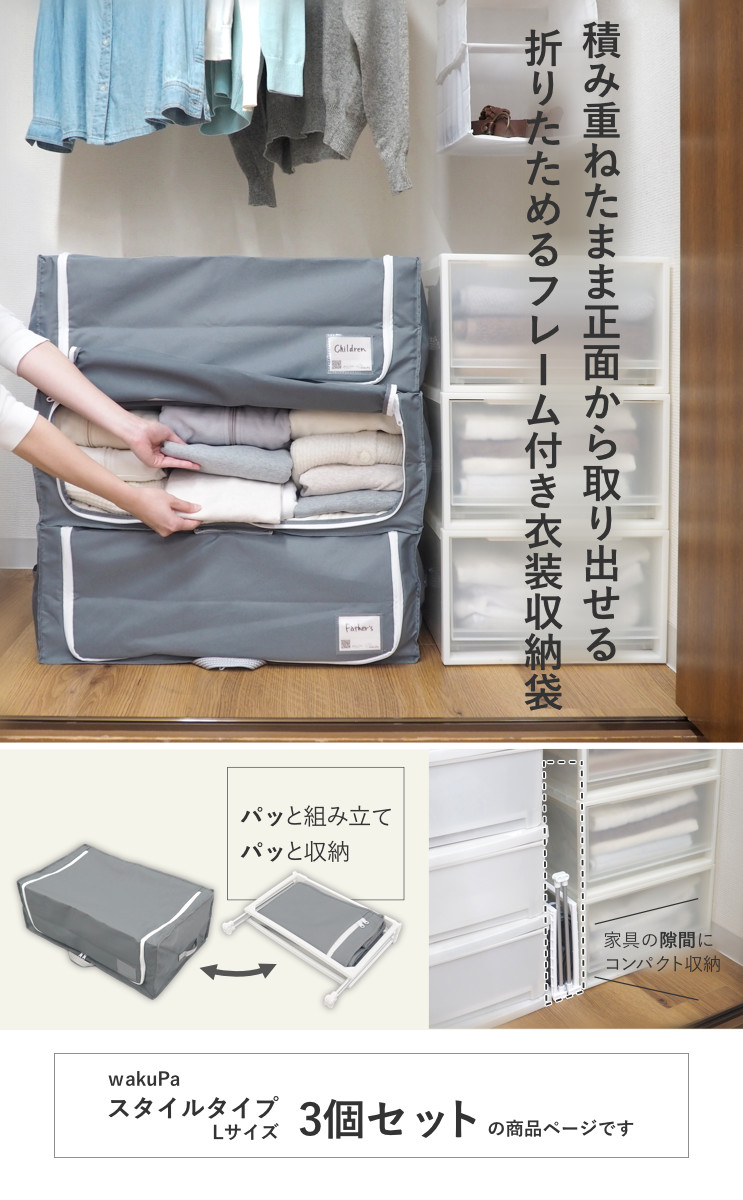 収納ボックス 3個セット 衣類収納 フレーム付き ワクパ スタイル L 幅66×奥行39×高さ23cm ( 折りたたみ 衣類収納袋 衣類収納ボックス 収納 収納ケース 洗濯 丈夫 衣替え 押入れ収納 クローゼット収納 整理整頓 前開き 積み重ね )