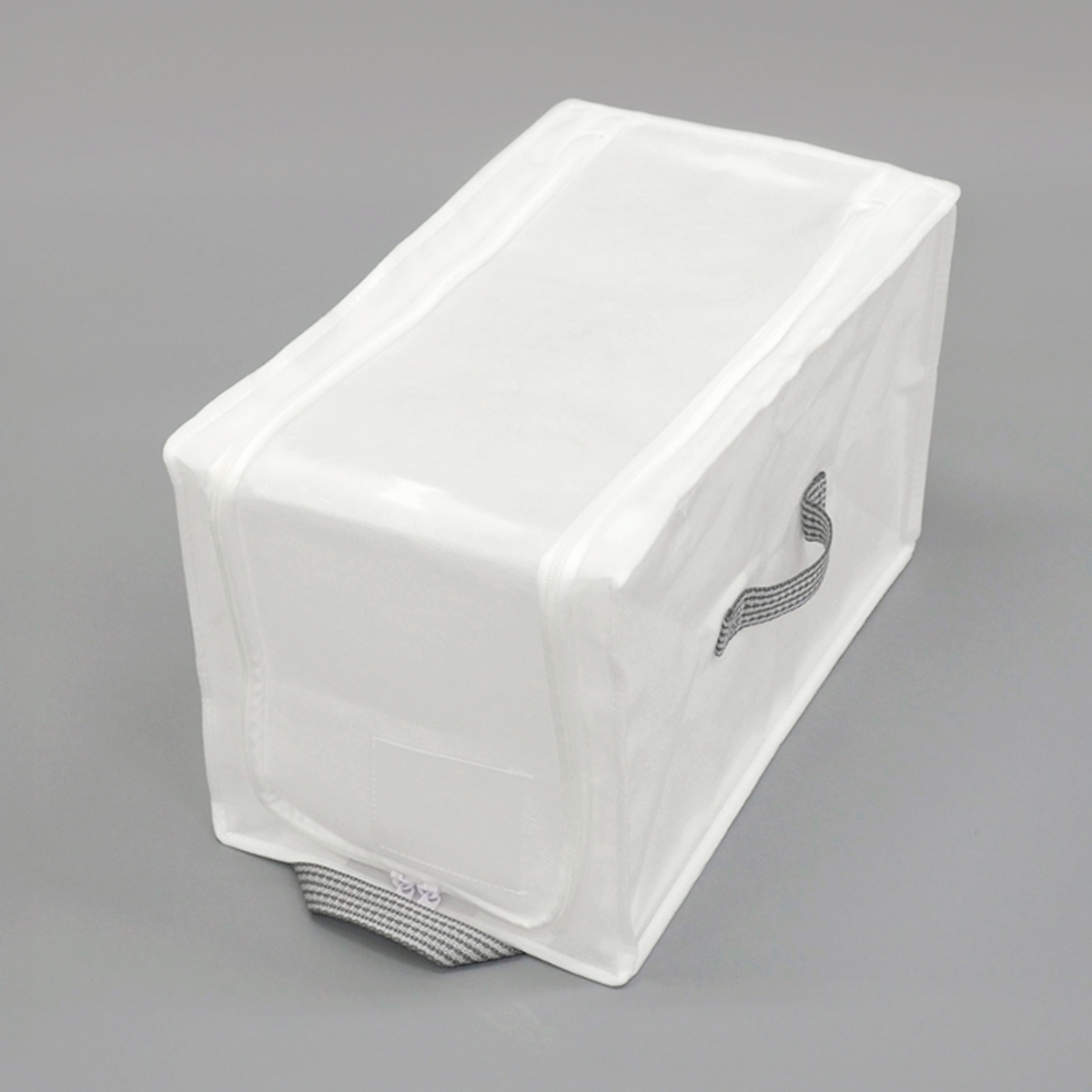 従来の不織布製の柔らかい収納袋の一面を持ちつつも、収納ケースのように積み重ねての使用を可能にした新形態の衣類収納袋です。