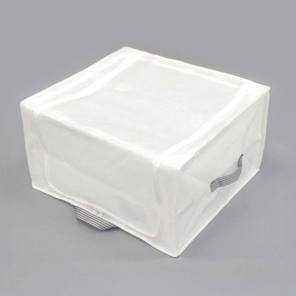 従来の不織布製の柔らかい収納袋の一面を持ちつつも、収納ケースのように積み重ねての使用を可能にした新形態の衣類収納袋です。