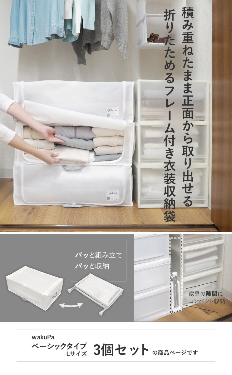 収納ボックス 3個セット 衣類収納 フレーム付き ワクパ ベーシック L 幅66×奥行39×高さ23cm ( 折りたたみ 衣類収納袋 衣類収納ボックス 収納 収納ケース 洗濯 丈夫 衣替え 押入れ収納 クローゼット収納 整理整頓 前開き 積み重ね )