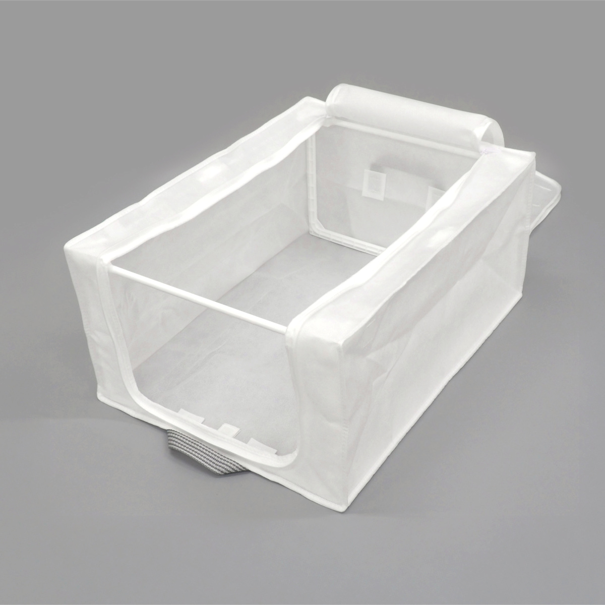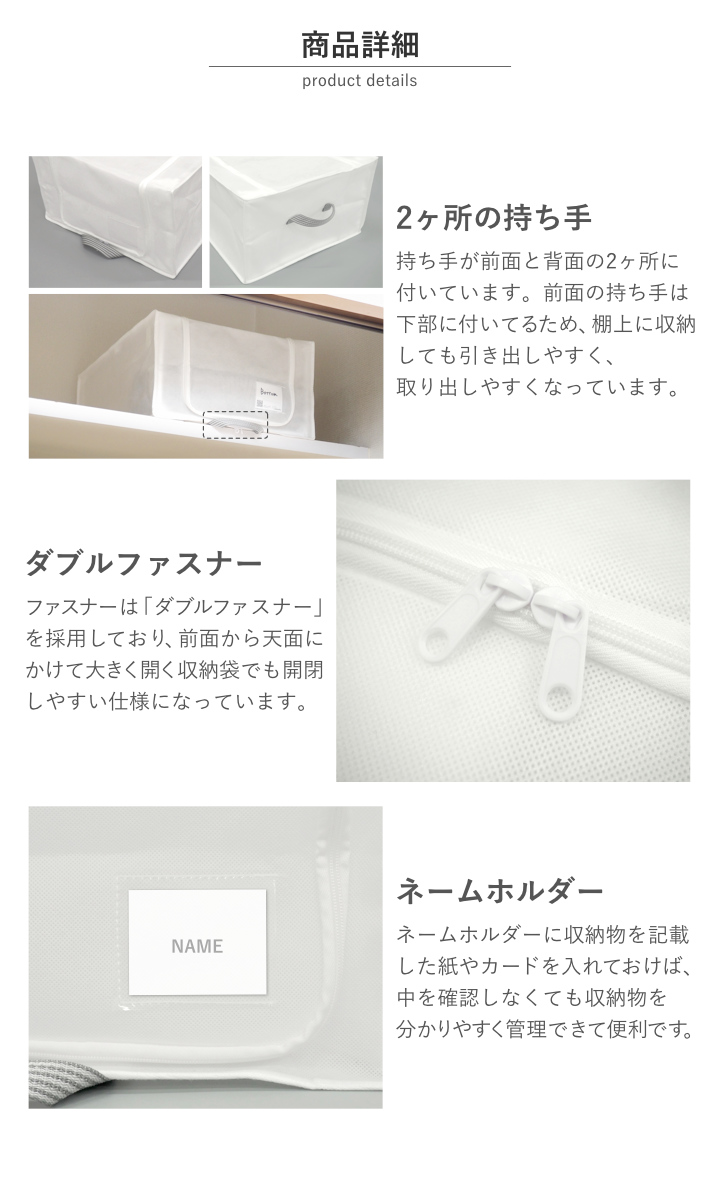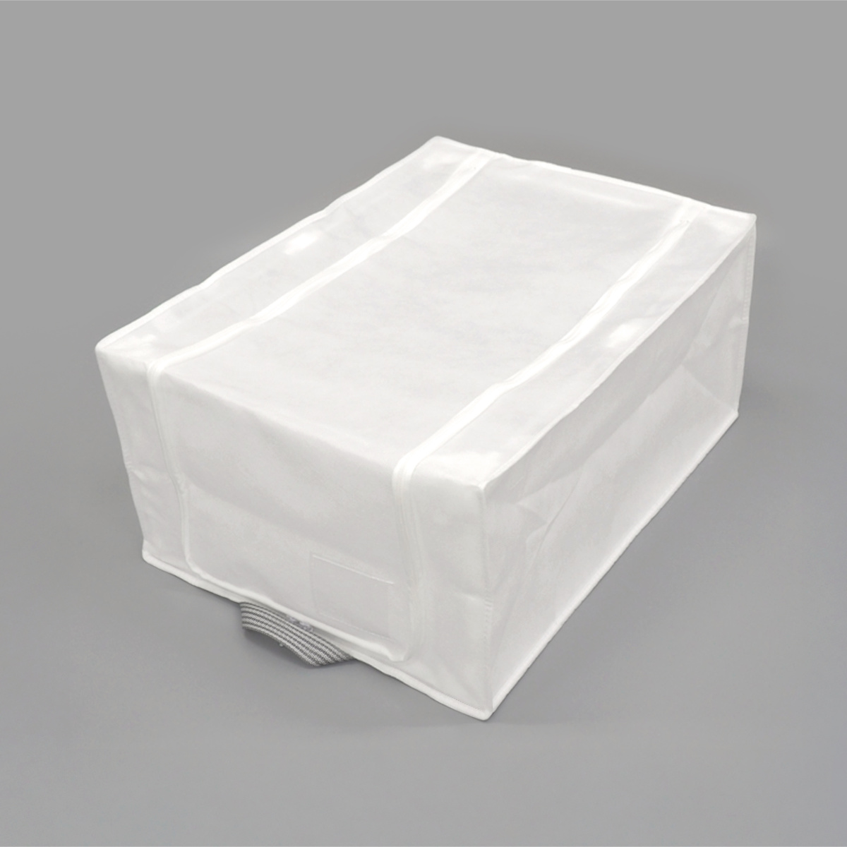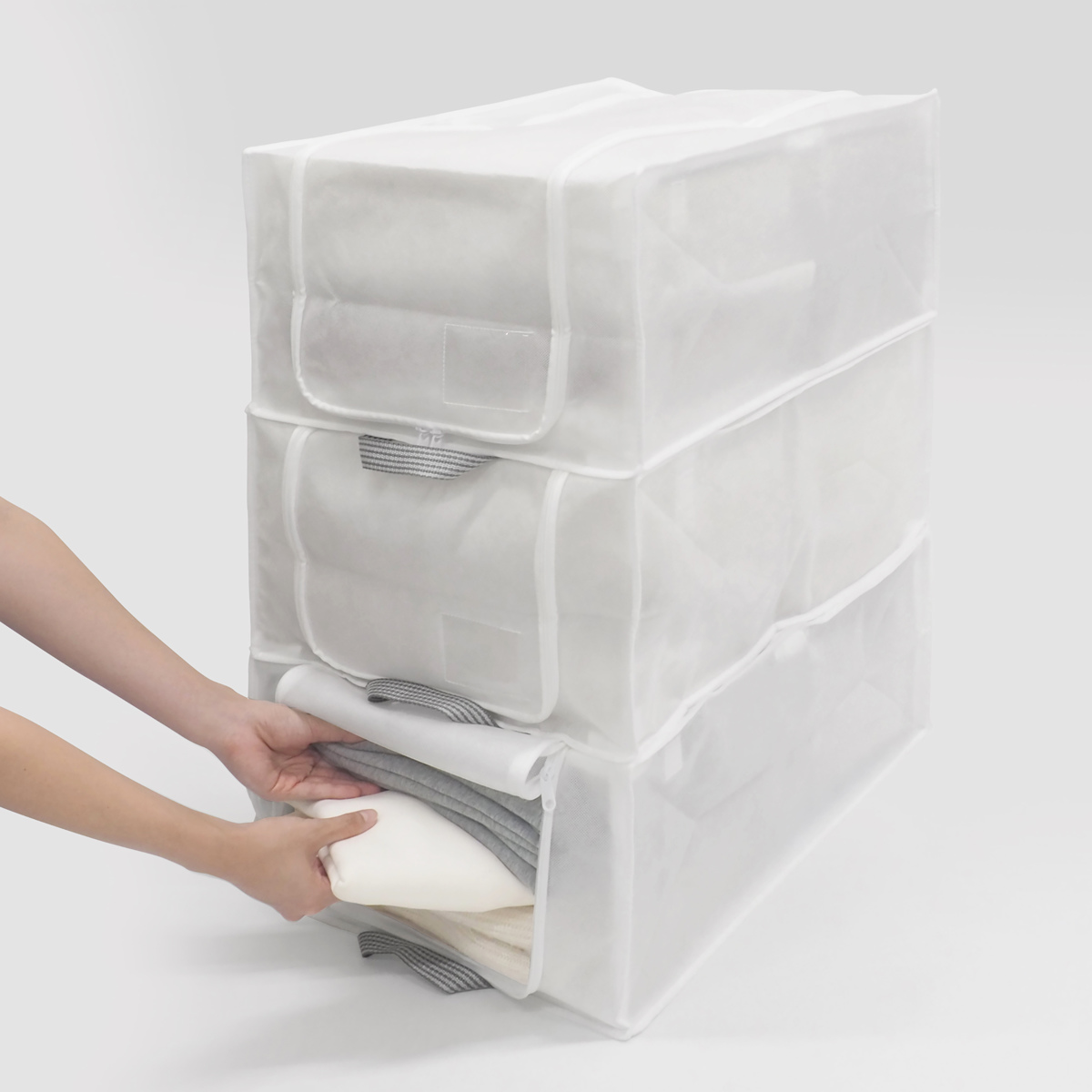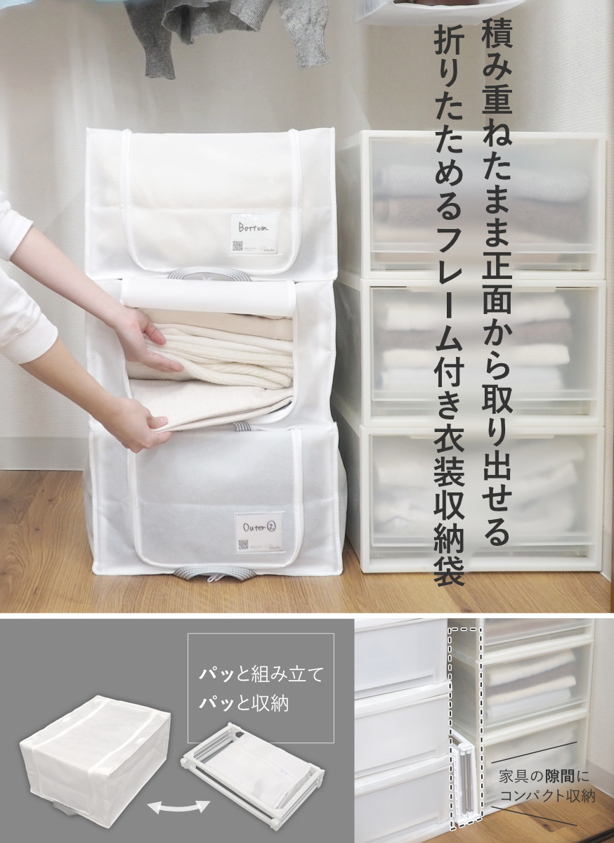従来の不織布製の柔らかい収納袋の一面を持ちつつも、収納ケースのように積み重ねての使用を可能にした新形態の衣類収納袋です。