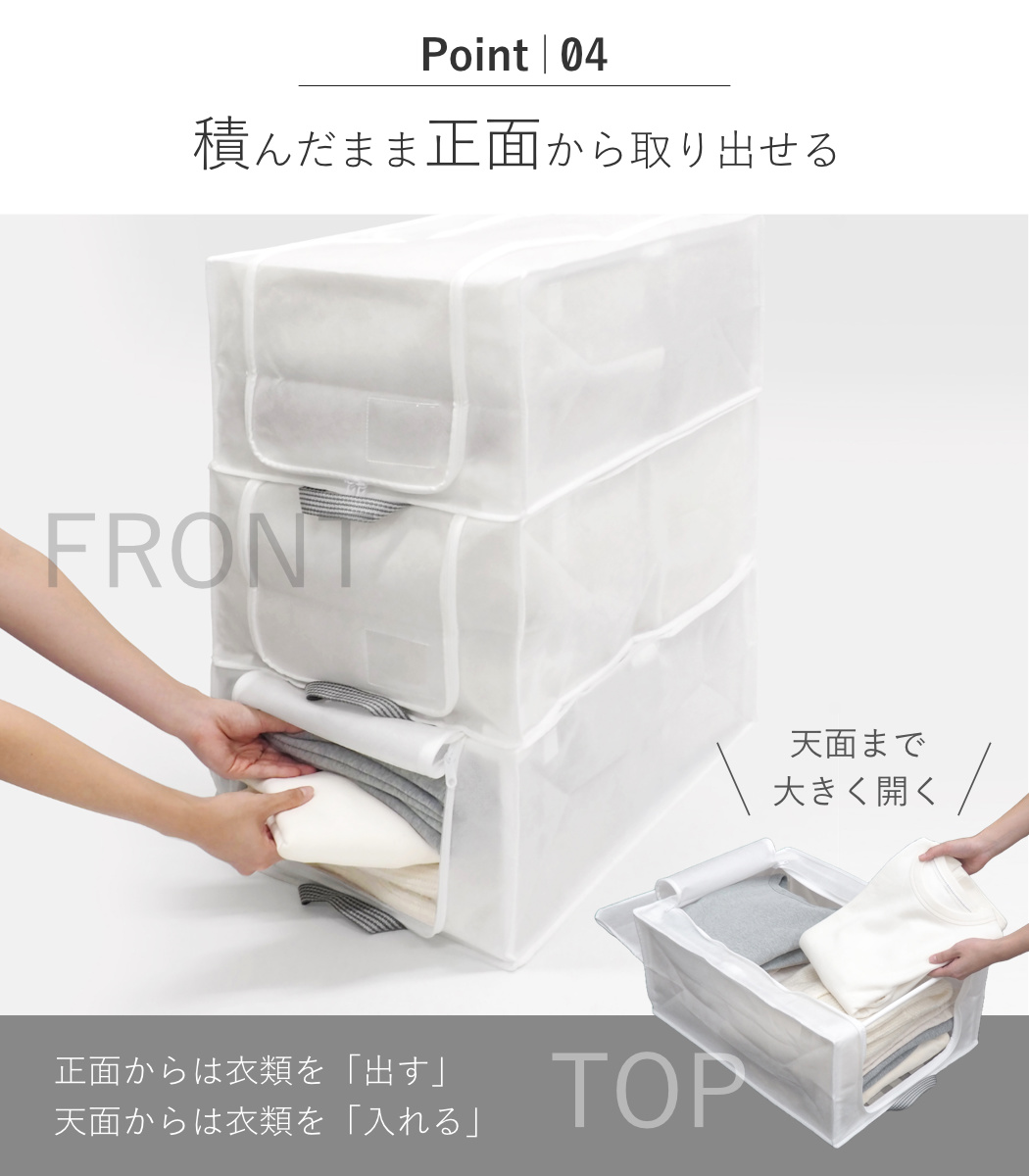 生地製の収納袋は積み重ねると重みでぐちゃっとつぶれて見た目が悪くなり、衣類を取り出す際も上に載っている収納袋をよける必要がありますが、wakuPa(ワクパ)はフレーム付きなので積み重ねても下が潰れることなく形状を維持してくれます。そのため、積み重ねた状態でも前面が開くので下段であっても衣類の取り出しが簡単に行えます。フタは前面から天面にかけてガバっと開くので、出し入れもスムーズです。