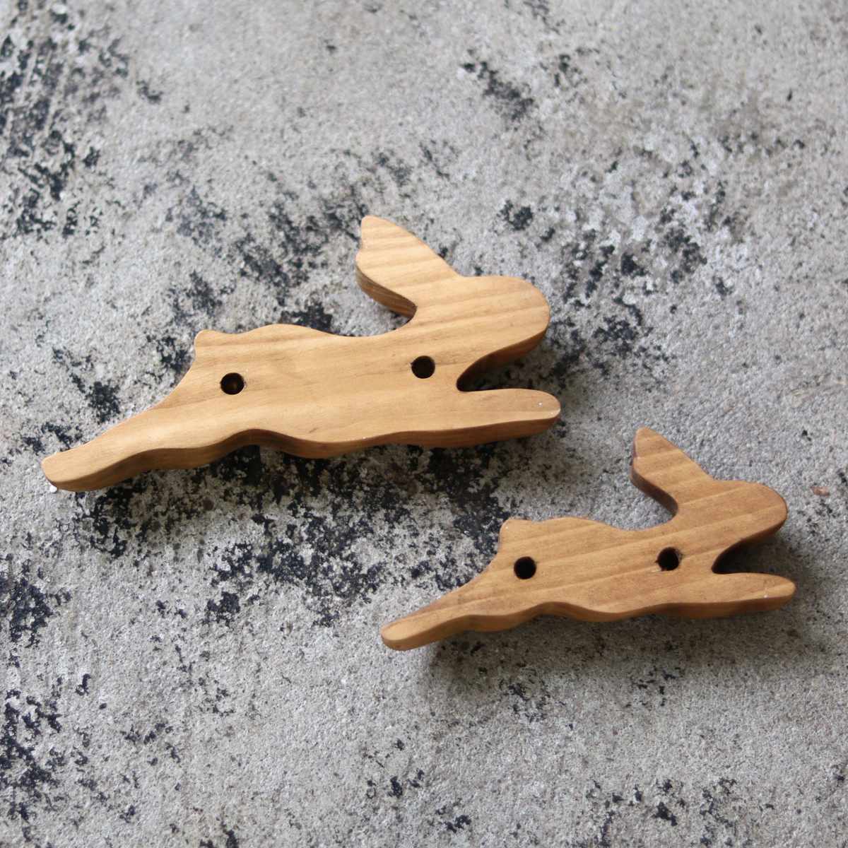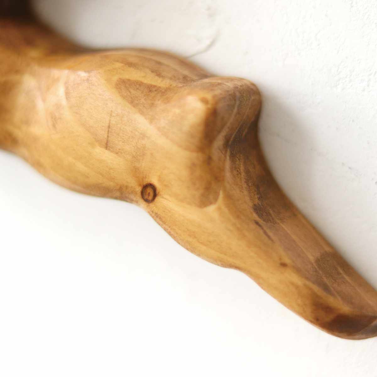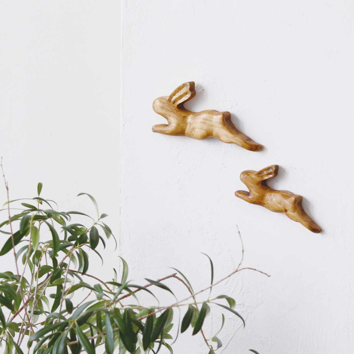 うさぎが跳ねる姿を、木材ならではの柔らかな曲線で表現したウォールオブジェです。北欧テイストのお部屋やアンティーク調の家具に調和し溶け込んでくれます。