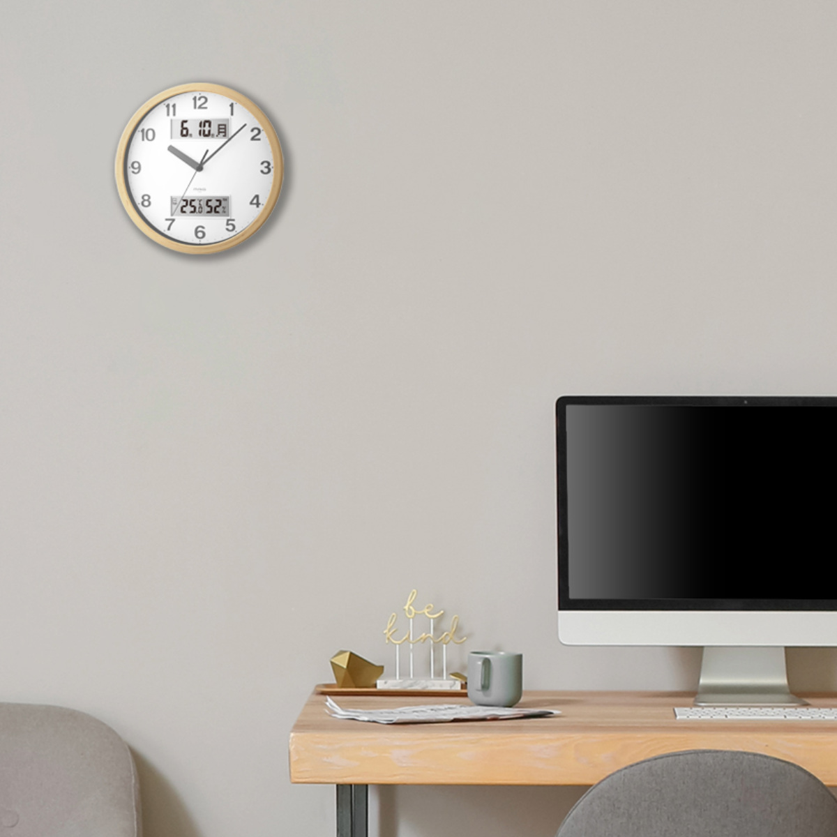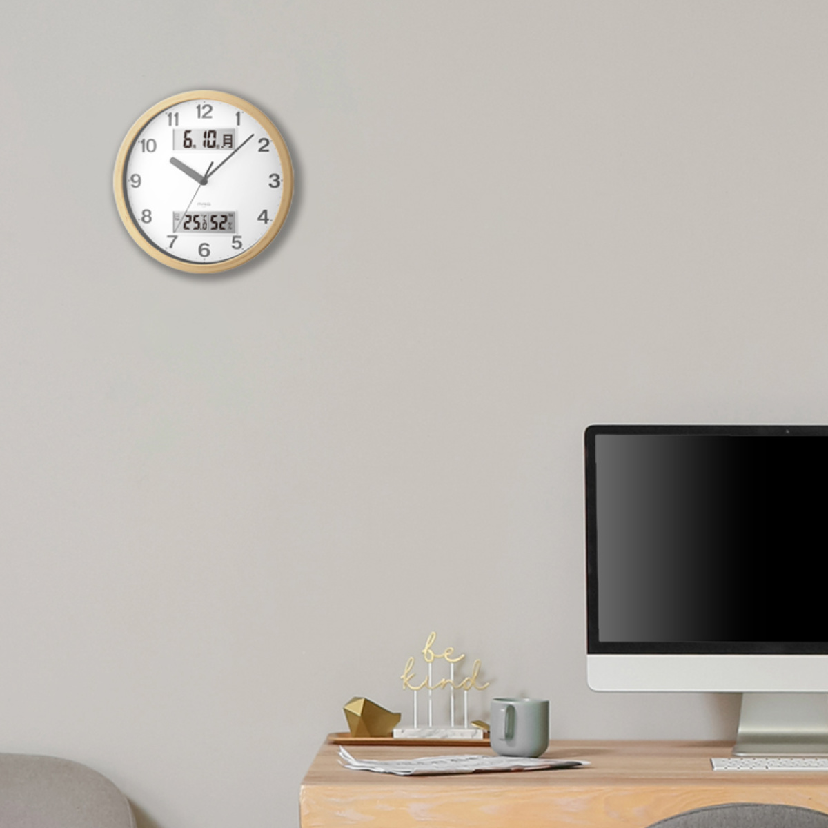 時刻、日付、温度、湿度が一目で分かる便利な掛け時計です。シンプルな文字板と見やすいサイズ感なので、リビングやオフィスのメインクロックにおすすめです。木目調の塗装をほどこしたナチュラルな雰囲気で、お部屋にあたたかみをプラスしてくれます。