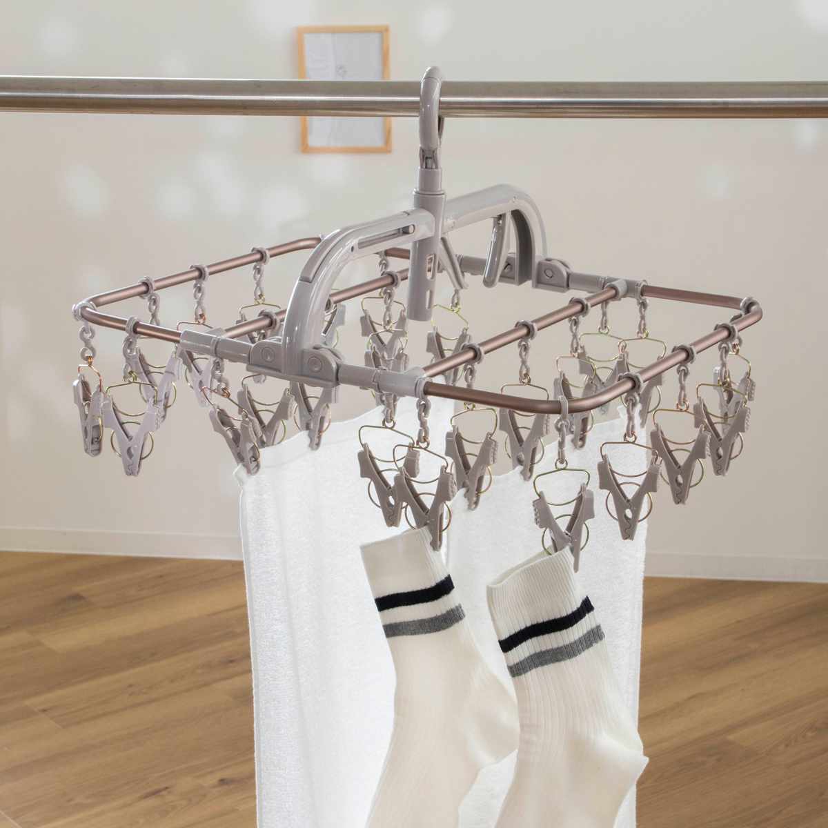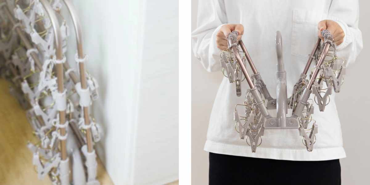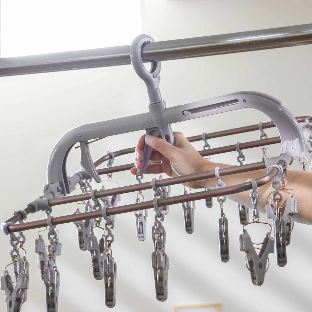 洗濯物を引っ張るだけで取り込み可能な24ピンチのランドリーハンガーです。下に引っ張ると負荷がかかってピンチが開く設計です。止める部分は緩やかなウェーブなので、デリケートな衣類も傷めにくいです。