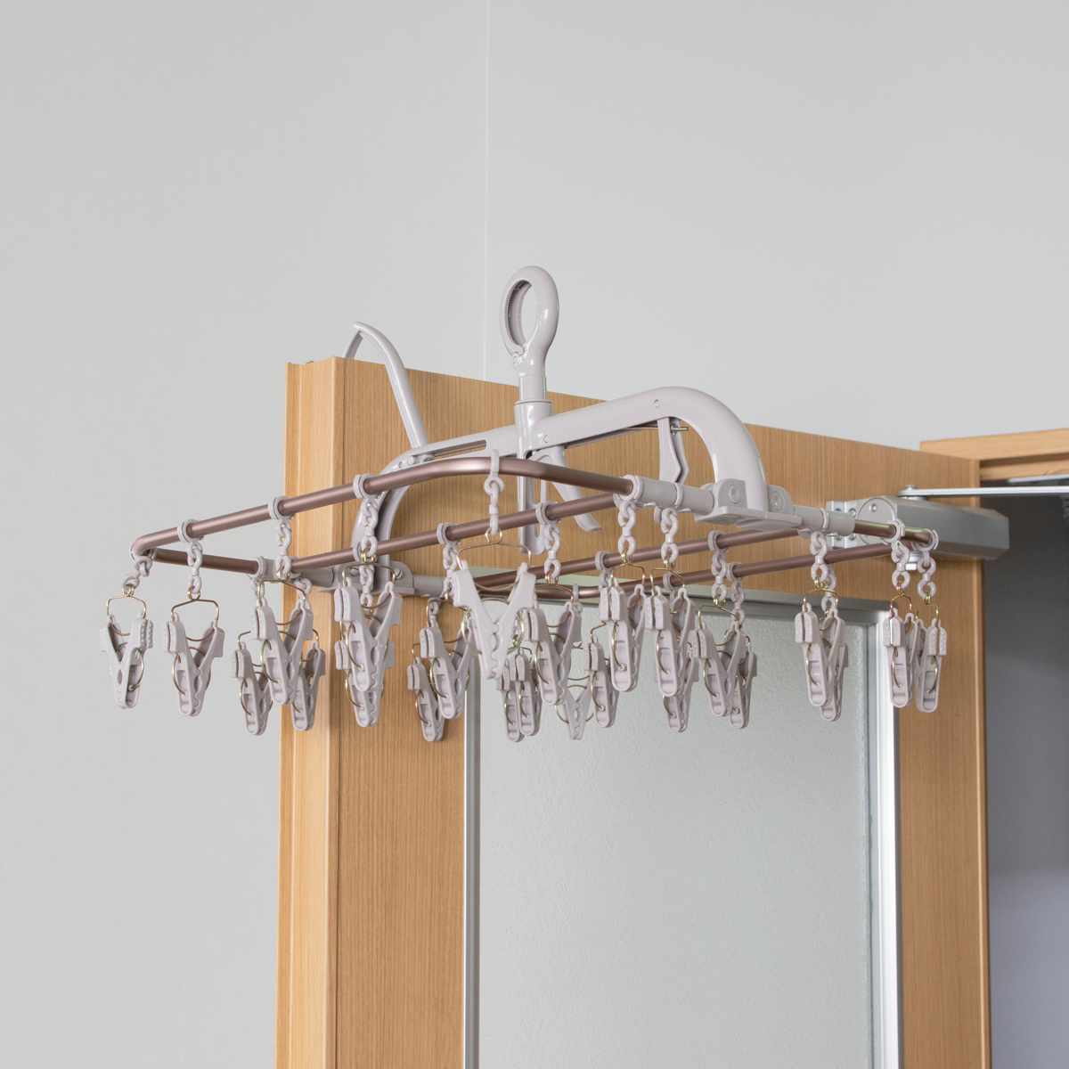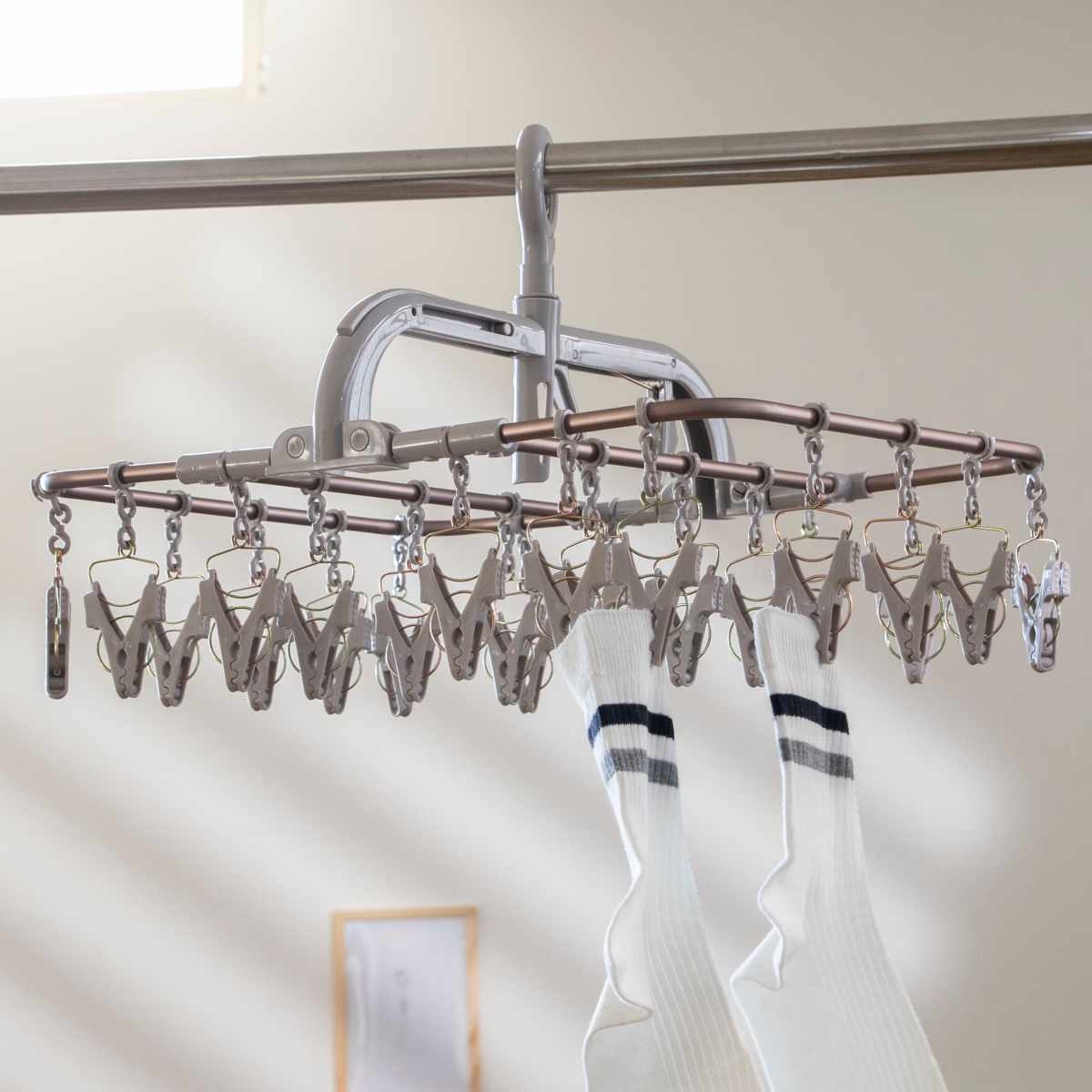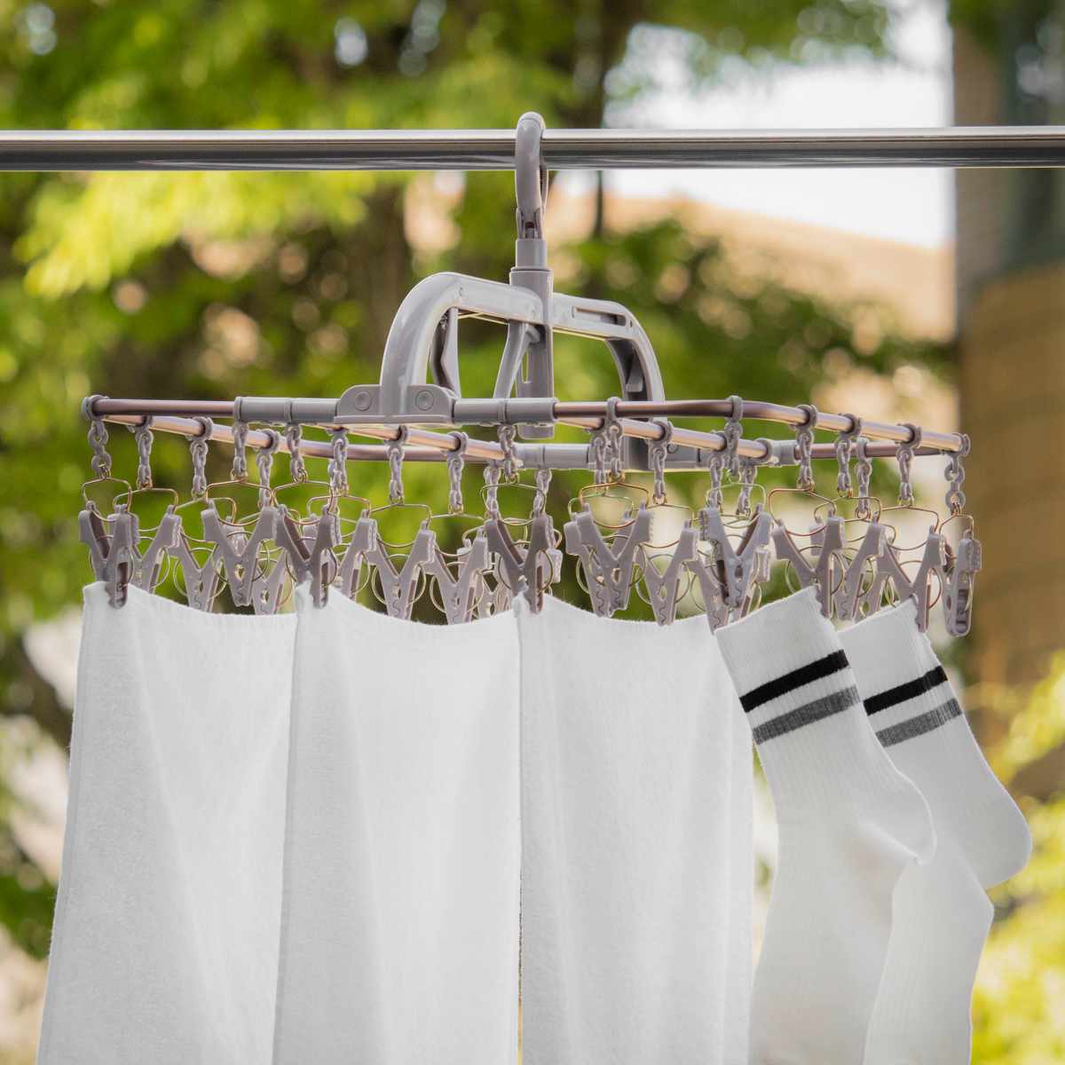 洗濯物を引っ張るだけで取り込み可能な24ピンチのランドリーハンガーです。下に引っ張ると負荷がかかってピンチが開く設計です。止める部分は緩やかなウェーブなので、デリケートな衣類も傷めにくいです。