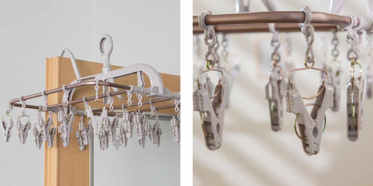 | カモイフック付き カモイ掛けが付いているので、カモイに掛けて部屋干しでも活躍します。 | 軽くて丈夫なアルミ製 本体はアルミ製なので軽量で頑丈です。ピンチ同士が絡みにくい設計になっており、滑りにくい仕様でつまみやすいです。 |