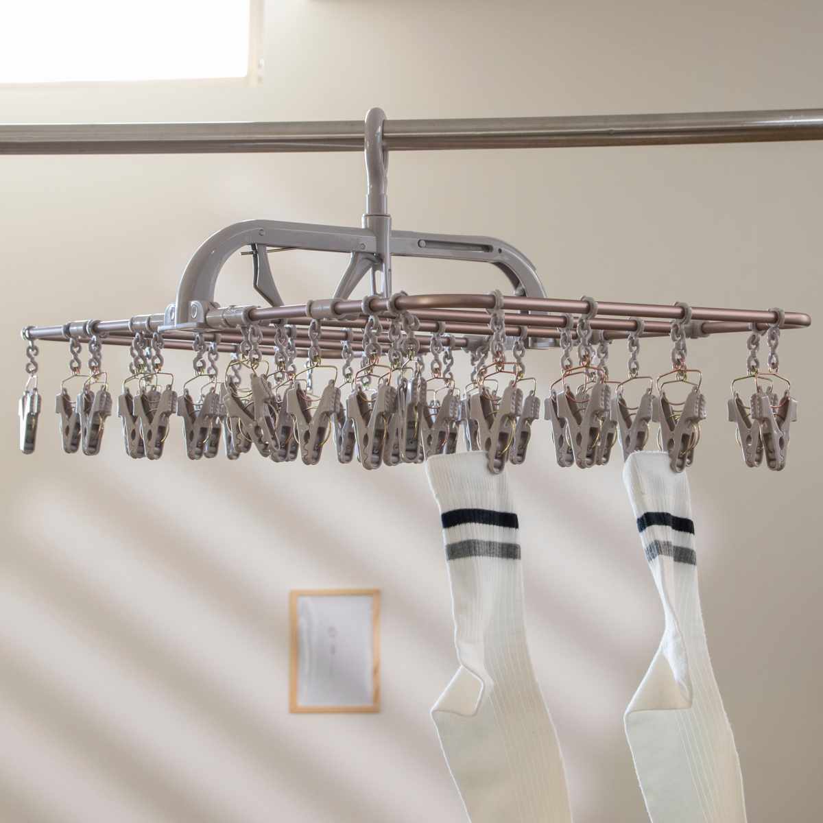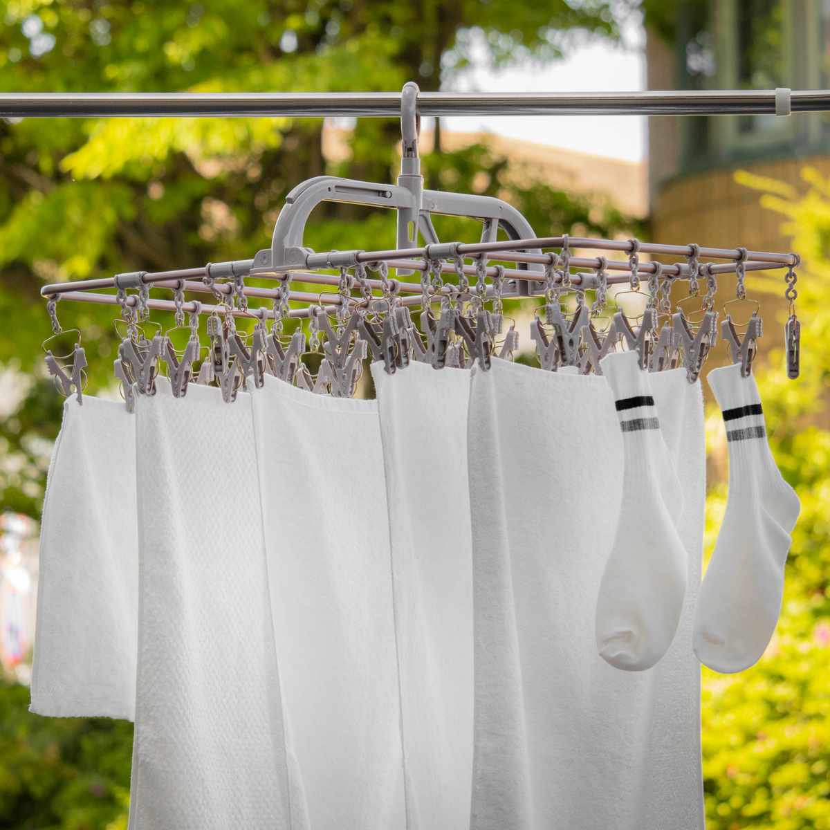 洗濯物を引っ張るだけで取り込み可能な42ピンチのランドリーハンガーです。下に引っ張ると負荷がかかってピンチが開く設計です。止める部分は緩やかなウェーブなので、デリケートな衣類も傷めにくいです。