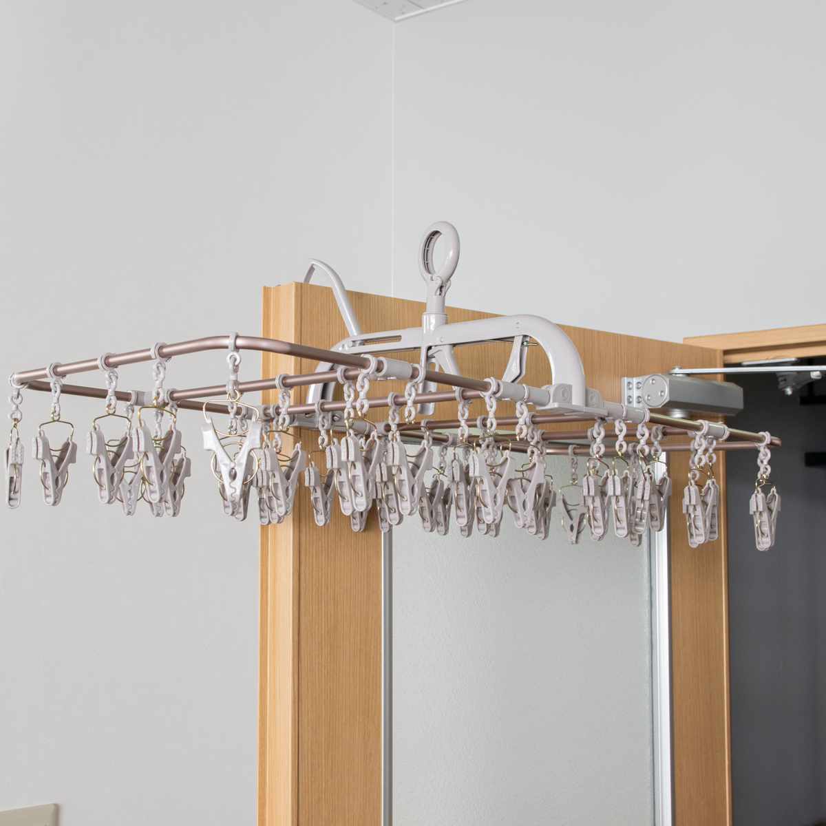 | カモイフック付き カモイ掛けが付いているので、カモイに掛けて部屋干しでも活躍します。 | 軽くて丈夫なアルミ製 本体はアルミ製なので軽量で頑丈です。ピンチ同士が絡みにくい設計になっており、滑りにくい仕様でつまみやすいです。 |