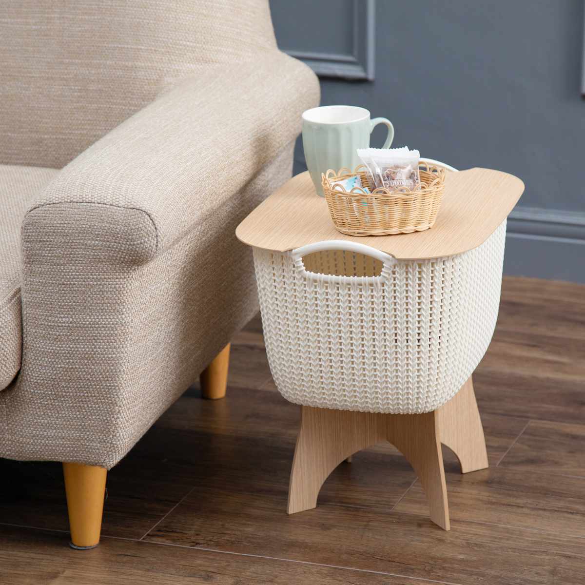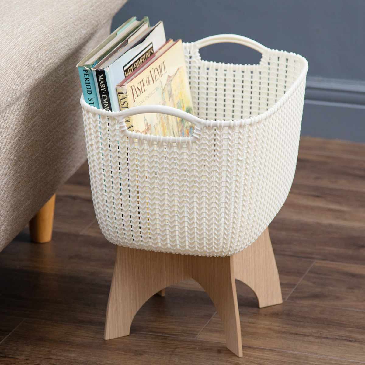 別売りのニットスクエアバスケット 19L専用のスタンドです。高さが出るのでソファ・ベッドサイドで雑誌やブランケットの収納に便利です。別売りのフタと組み合わせることでさらに使用シーンが広がります。